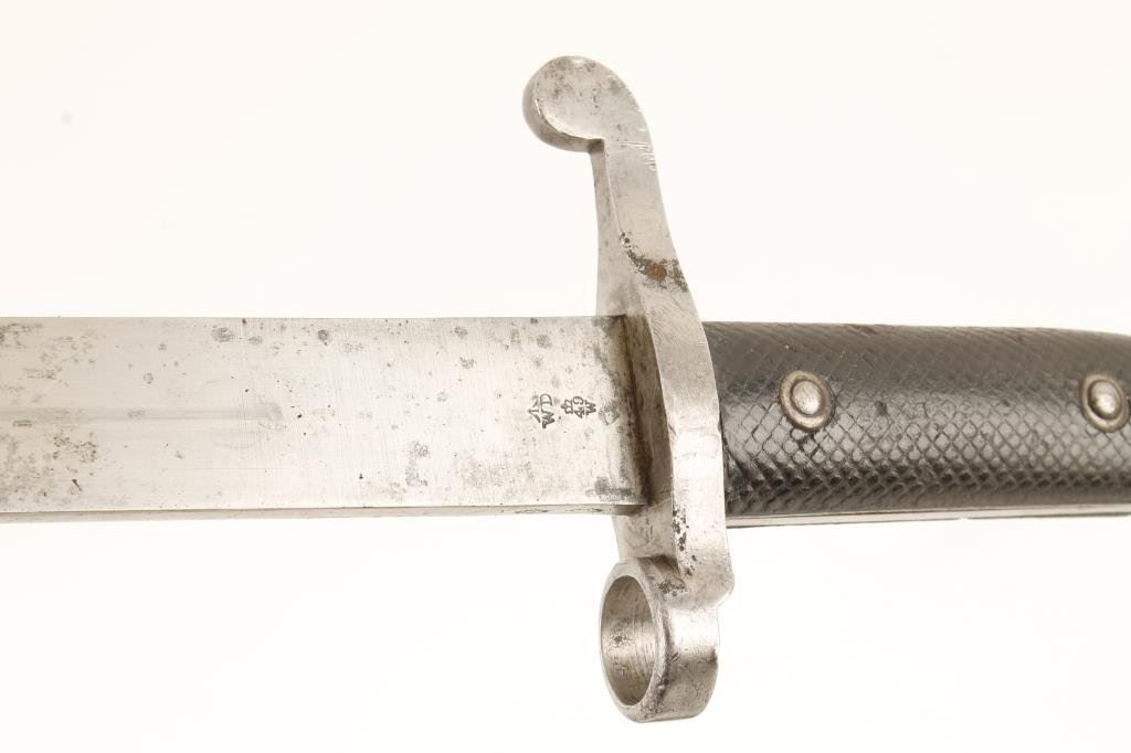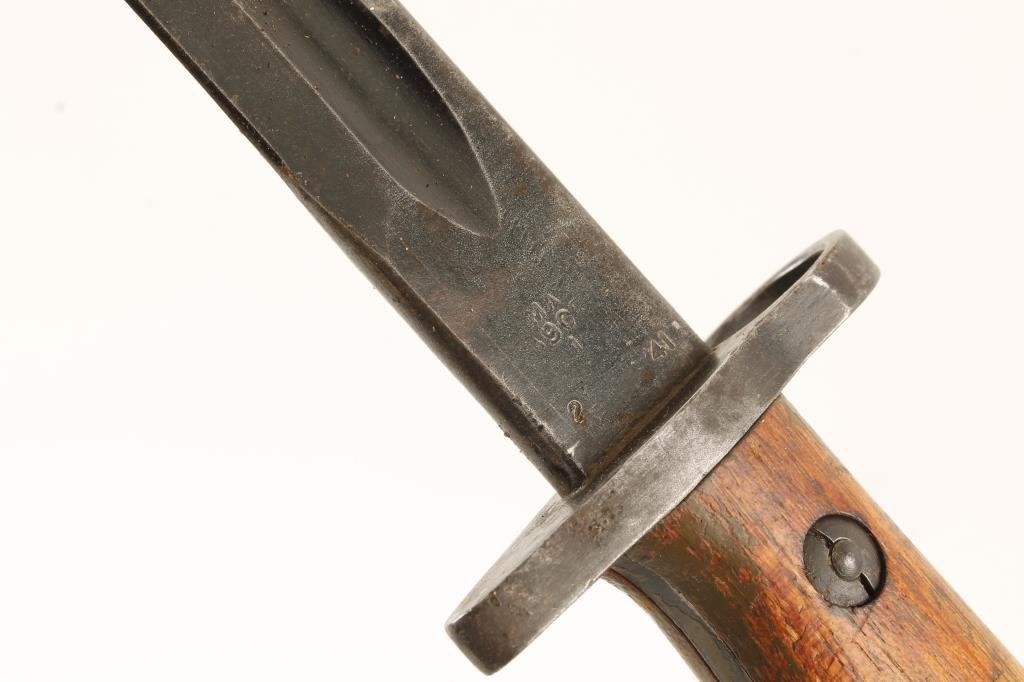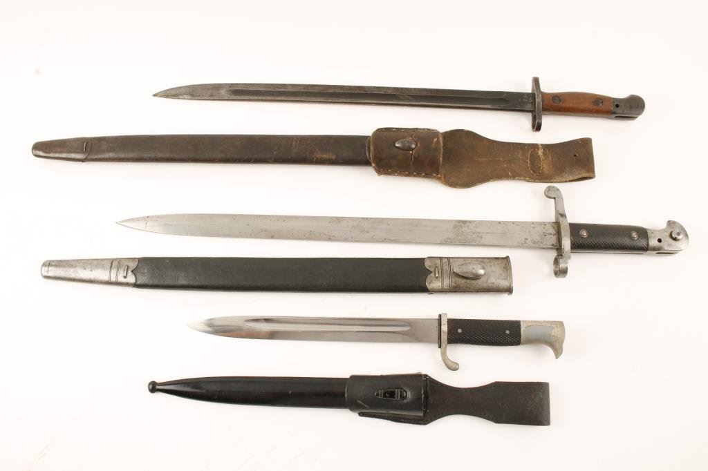 Lot of 3 bayonets and sheaths including a British 1907 Model S/N 43397 with leather hanger; a Wilkinson Sword Co. 1889 for a Martini-Henry rifle, S/N 7984; also a German un-marked bayonet with metal sheath and leather hanger. Est.: $125-$250.