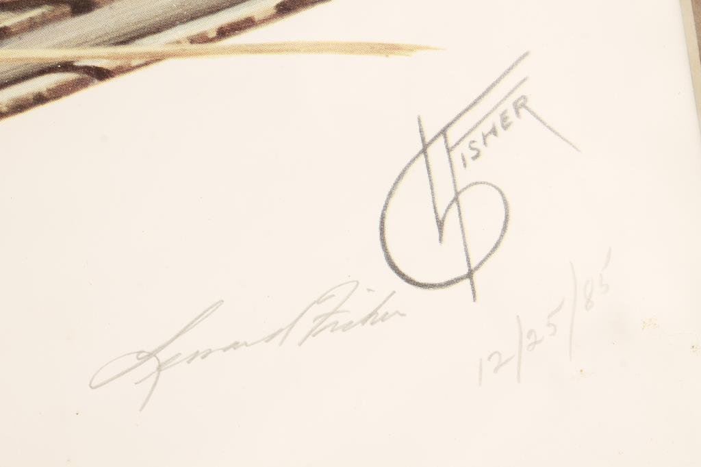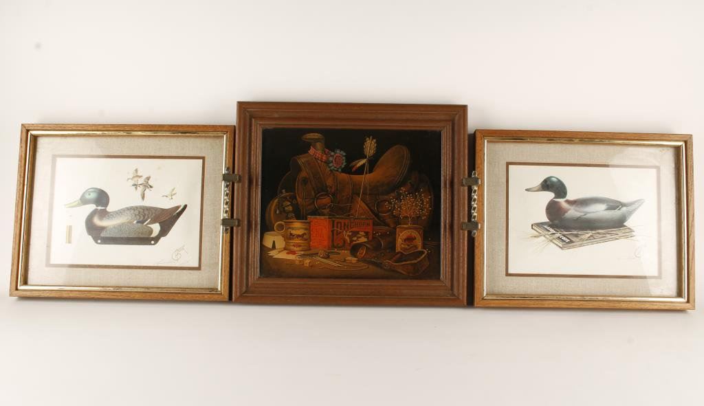 Lot of 2 framed and matted duck prints, each approximately 12” x 15”, hand signed by artist Lenard Fisher and dated 12/25/85; also a framed color print serving tray with a Great Old Western Theme, approximately 14” x 16”. Est.: $40-$80.