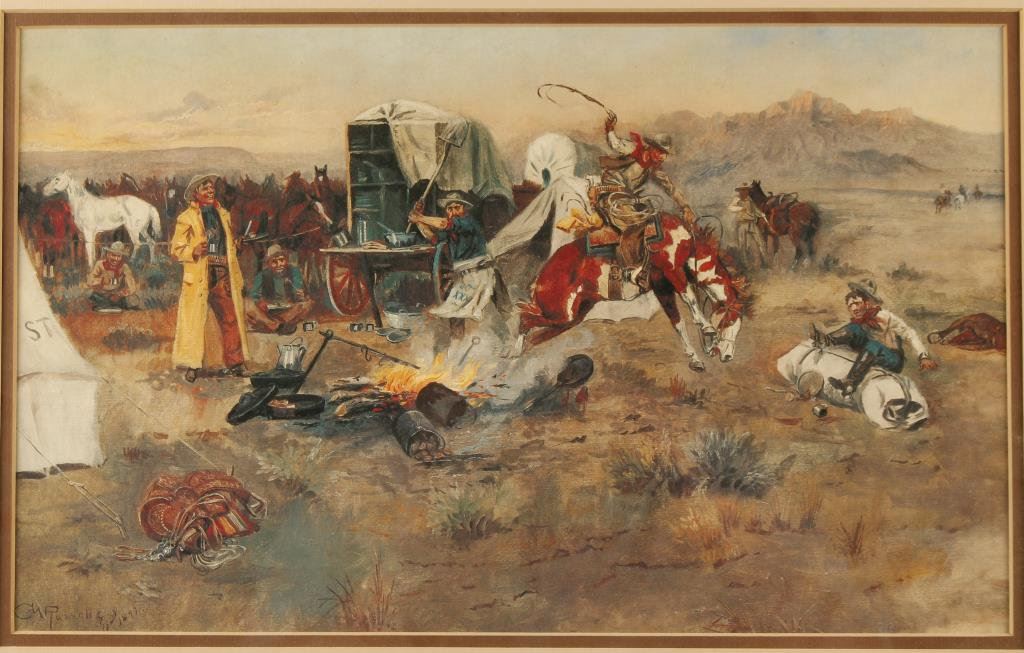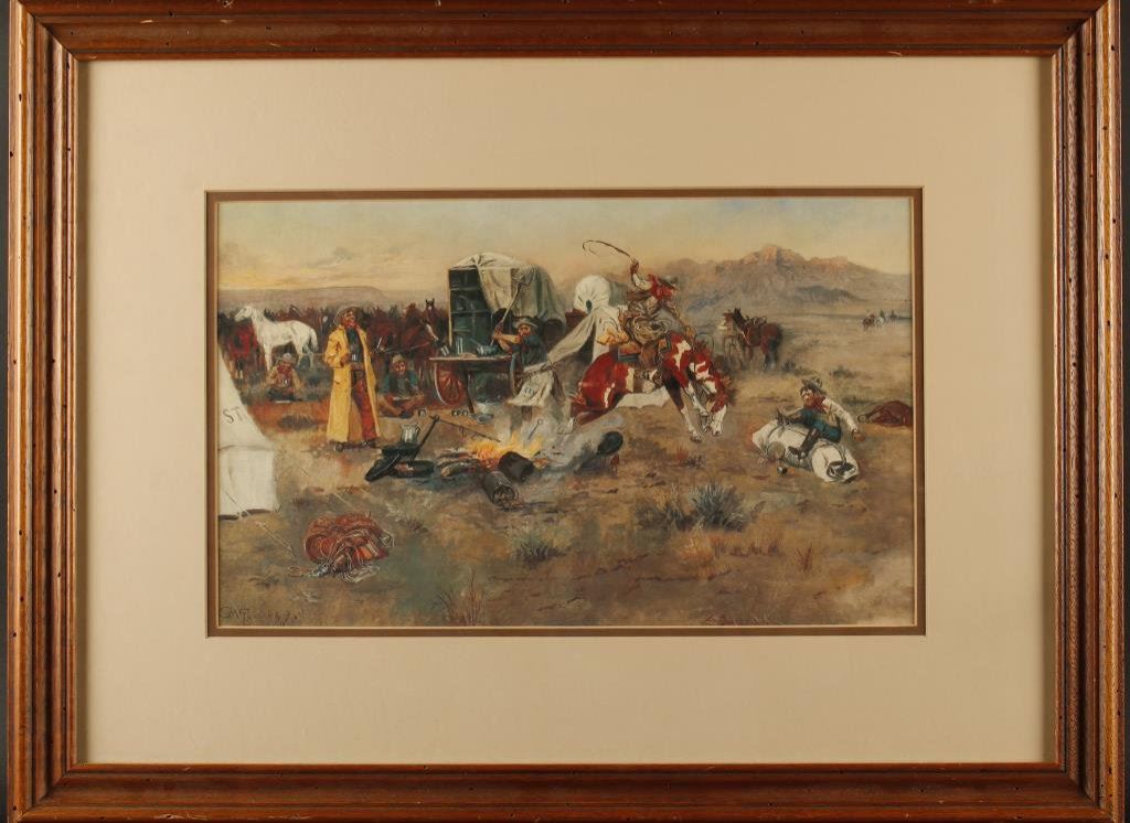 Beautifully framed and matted Charlie Russell colored lithograph entitled “Bronco in Cow Camp” approx. 19” x 24-1/2” in fine condition. Est.: $50-$100.