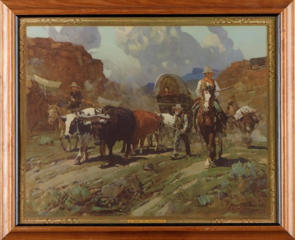 Framed color print from the estate of famous Western artist Frank Tenney Johnson (1874-1939) entitled “A Party of Immigrants” (1939; one of his last works), approximately 19” x 22.5” overall; with Certificate of Authenticity. Est.: $75-$125.