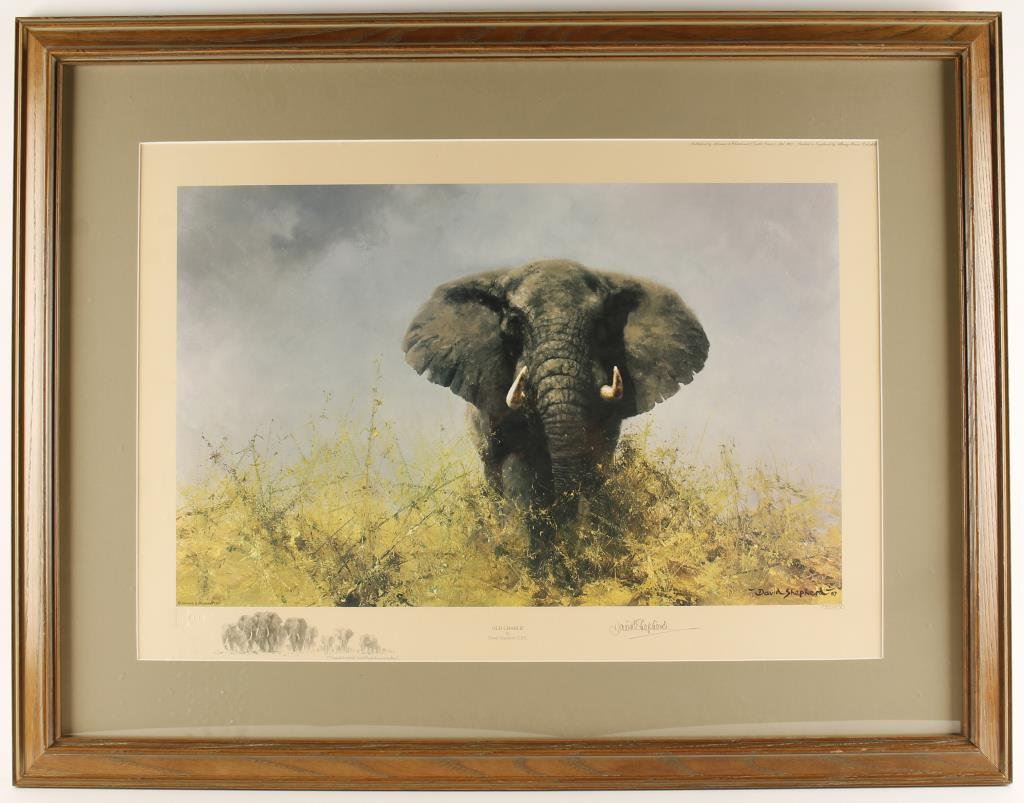 Beautifully framed and matted color limited edition (735/850) litho of a bull elephant and hand signed by noted wildlife artist David Shepherd, published by Solomon & Whitehead (1987); approximately 27” x 35” overall. Est.: $100-$200.
