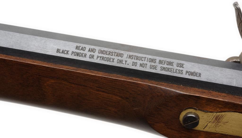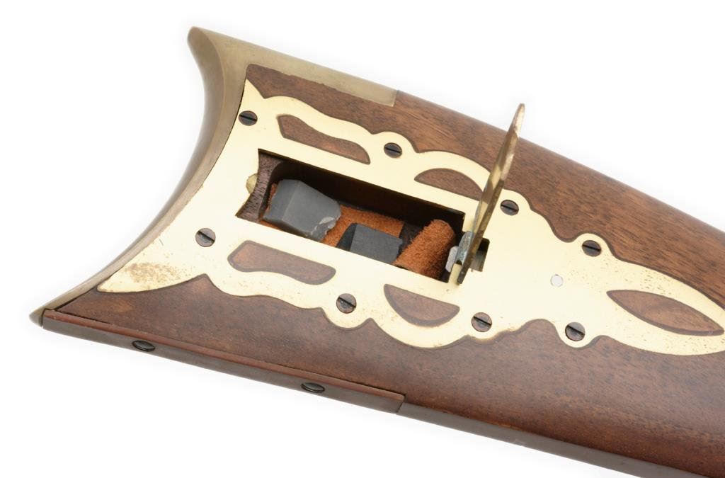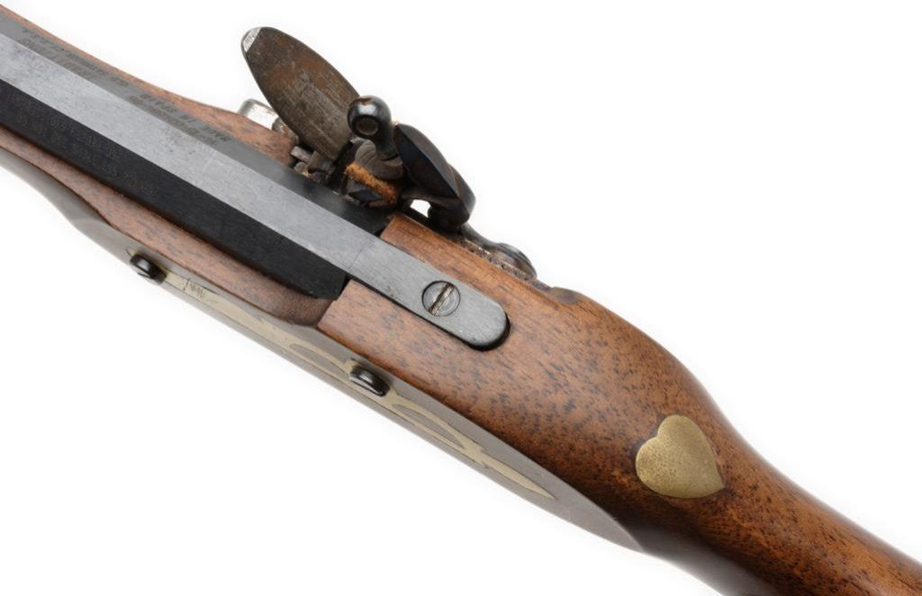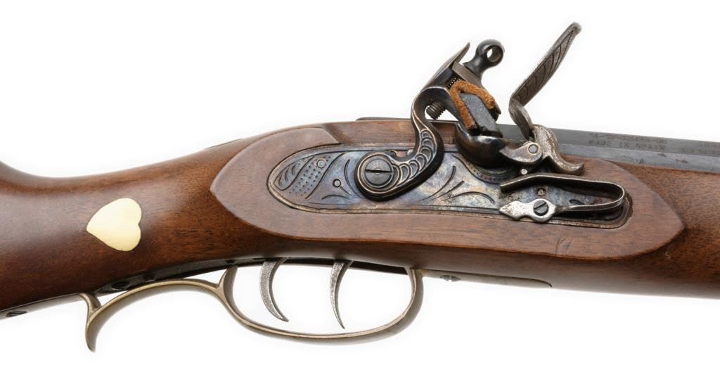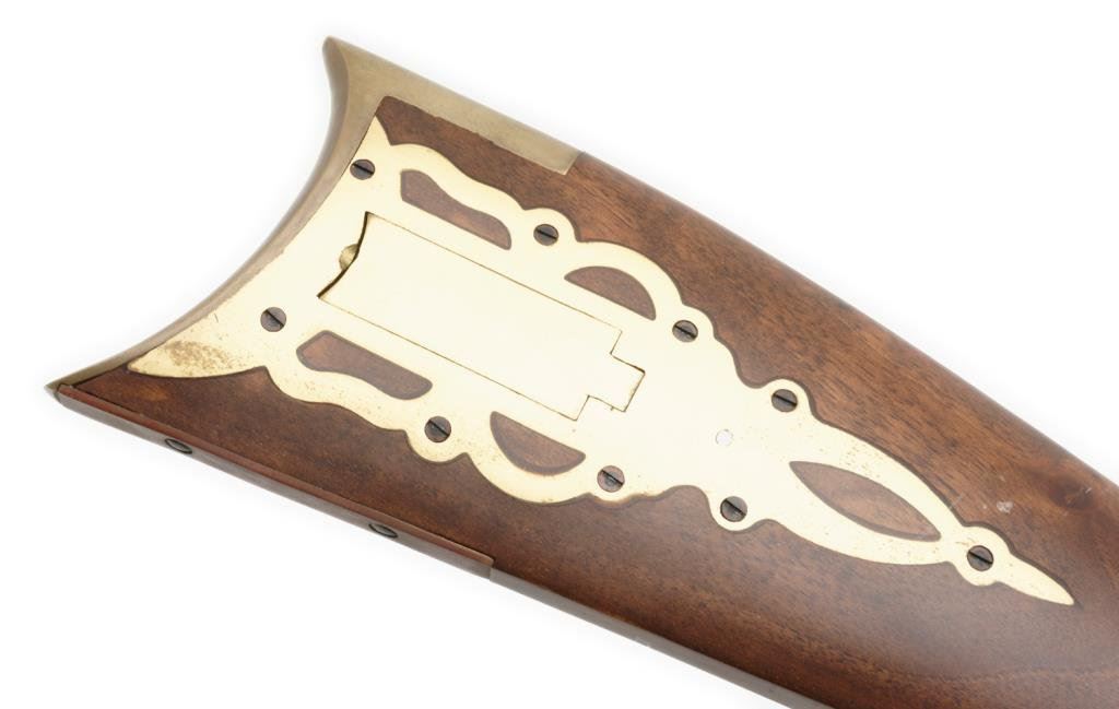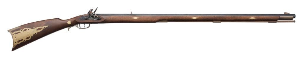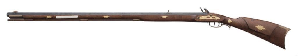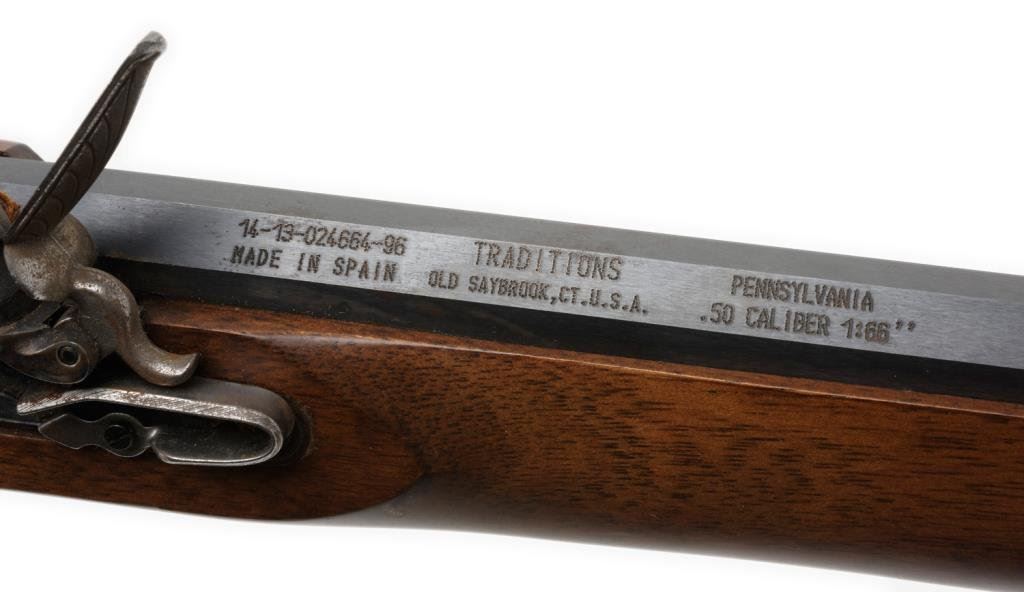 Spanish-made copy of a flintlock full stock rife”Traditions” model, .50 caliber, 40” barrel, blue and case hardened; overall very good to fine condition. Est.: $100-$200.