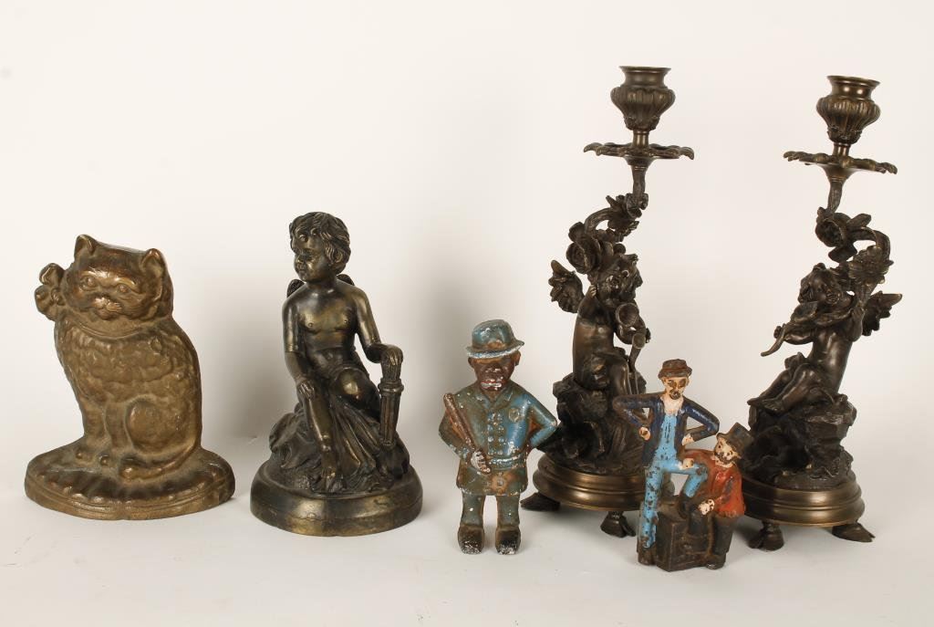 Lot of metal decorators including a pair of bronze ornate candlestick holders; a bronze desktop size cherub; an owl book end and two metal toys; one a policeman in uniform and the other of two “dandies” by a metal chest. Est.: $100-$300.