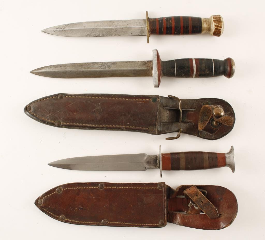 Lot 2643 Lot of 3 “in-theater” knives; two with sheaths. Est.: $100-$200.