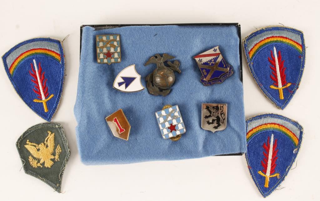 Infantryman’s lot including a small riker case of pins, some patches and a poster. Est.: $150-$300.