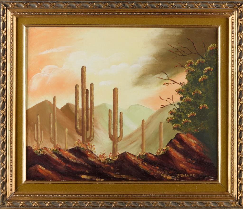 Framed original oil on canvas of desert scene signed S. Blake, approximately 22” x 25.5” overall. Est.: $100-$175.