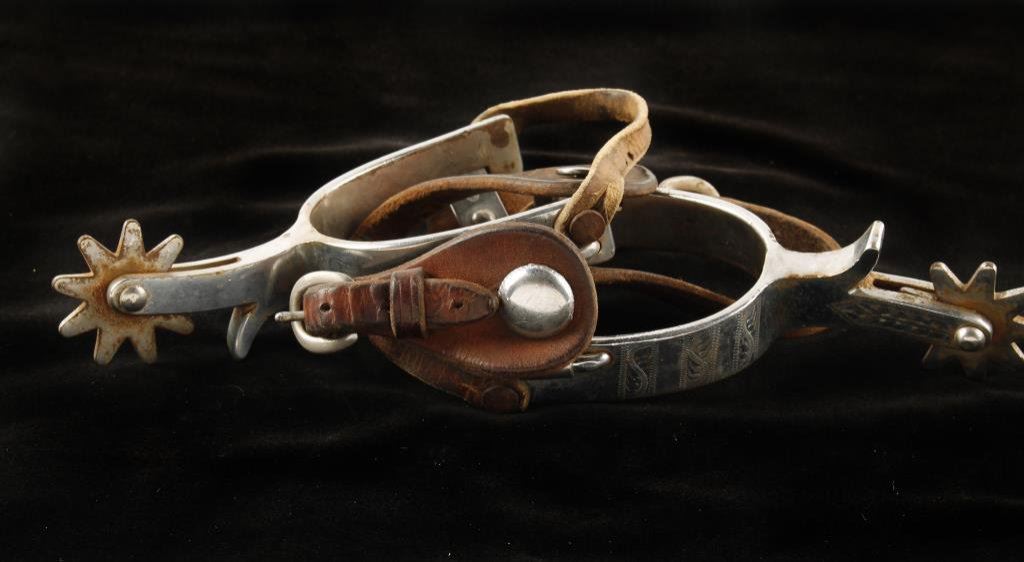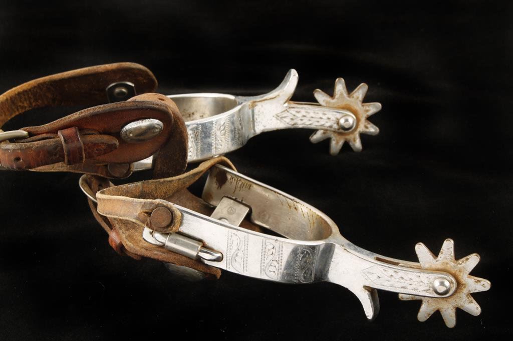 “CR”-marked pair of engraved spurs with leather straps; from an old Texas collector. Est.: $125-$250.