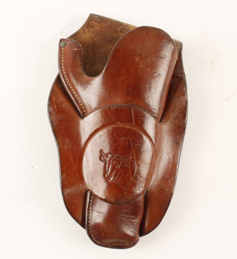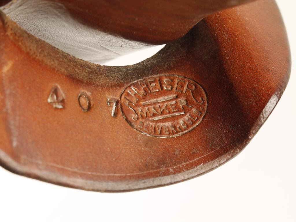 Leather Single-Loop Holster Marked H.H. Heiser, Denver, Colo. Also marked “407” with bull’s head on the face of the loop. Condition: This holster is in overall very good condition and appears to fit a 4.75” Colt Single Action Army revolver. EST.: $150-$300