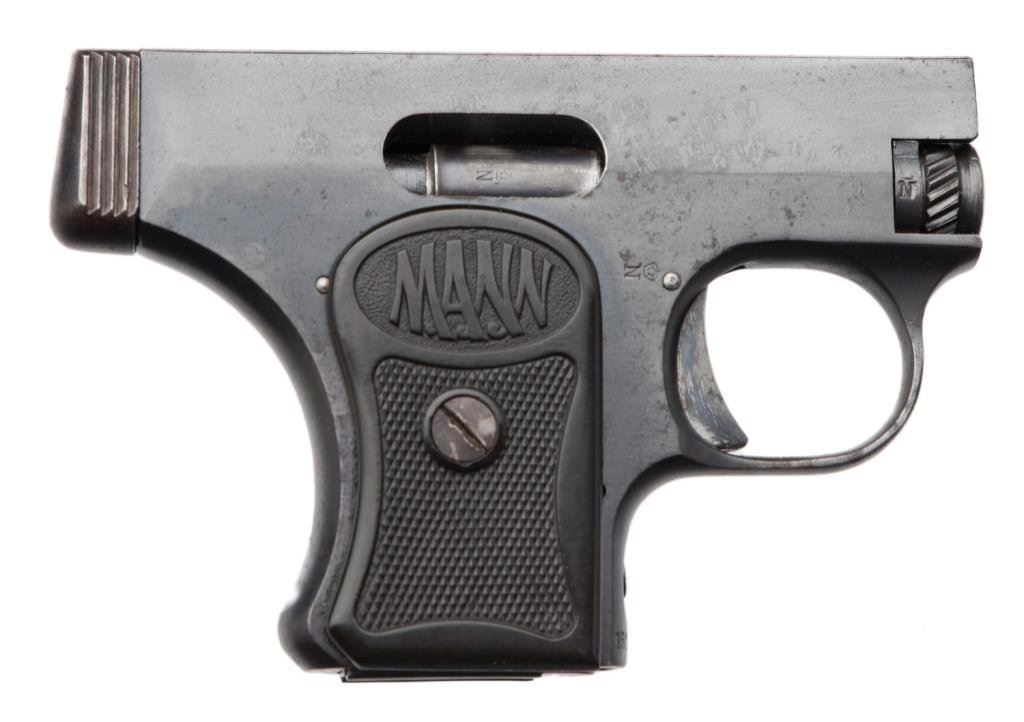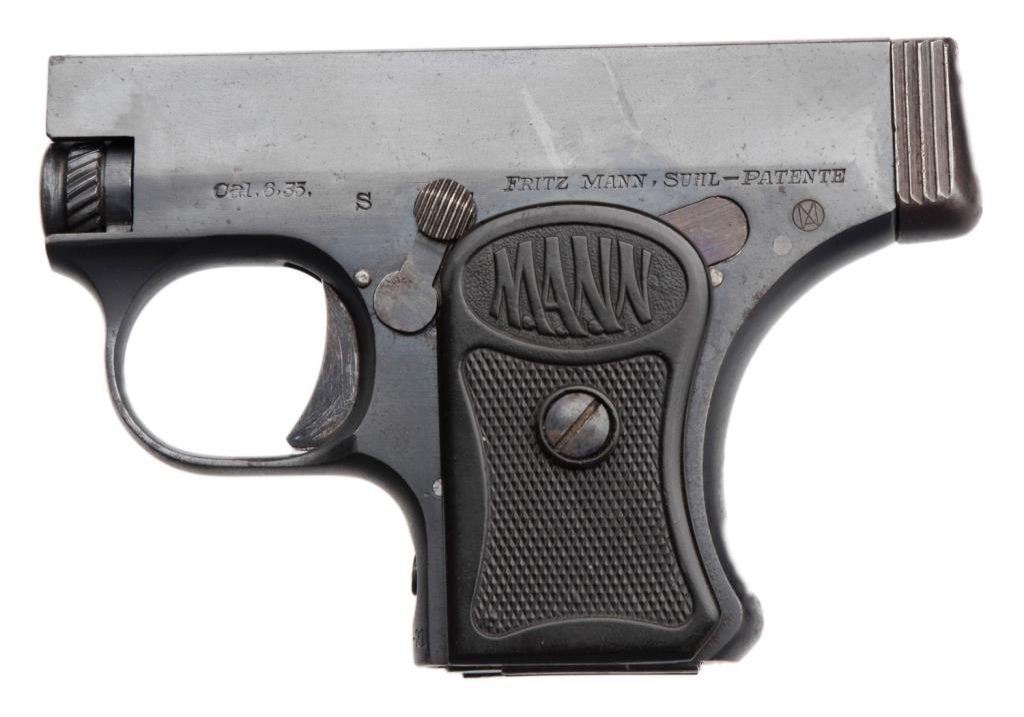 **Fritz Mann semi-automatic pocket pistol, 6.35mm caliber, 1.75” barrel, S/N 15284-21, blued finish, checkered grips in overall very good to fine condition and a scarce little pistol. Est.: $300-$600.