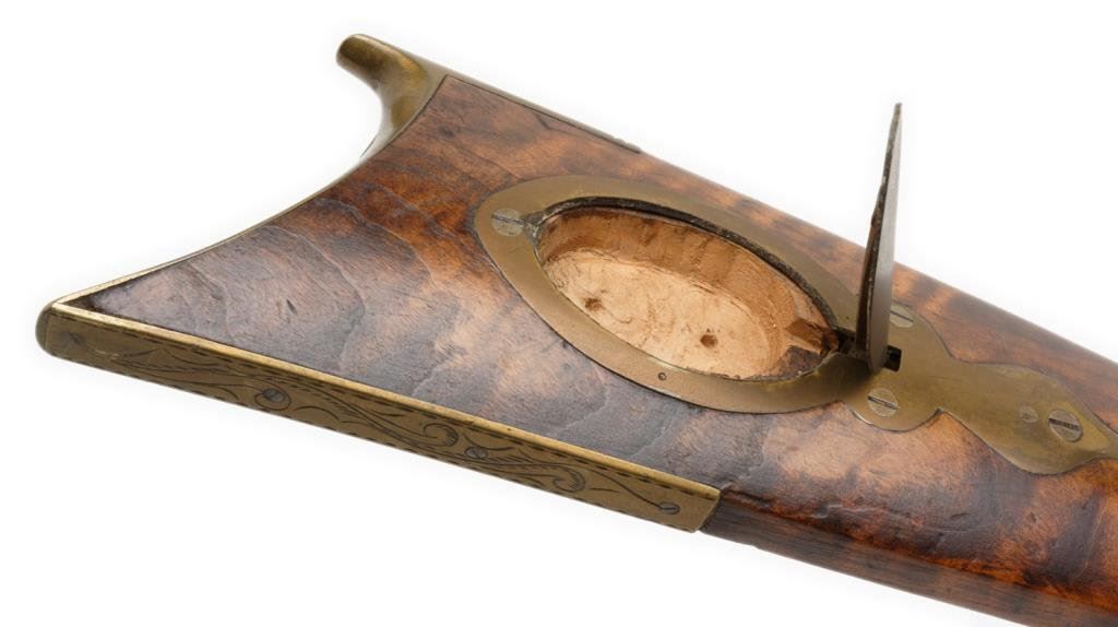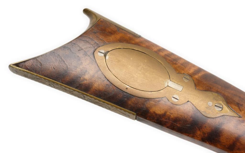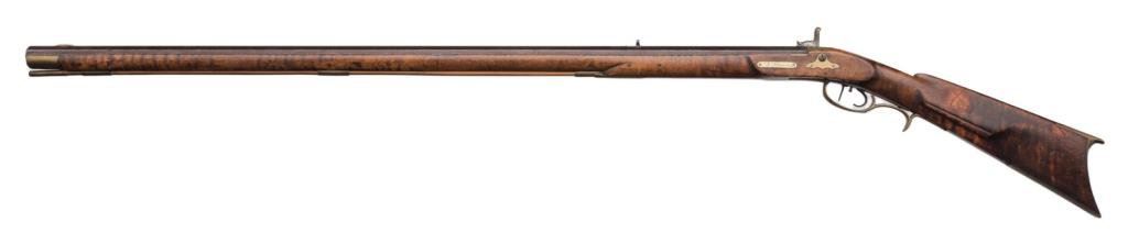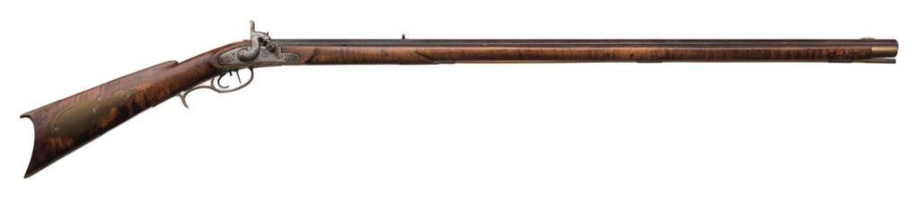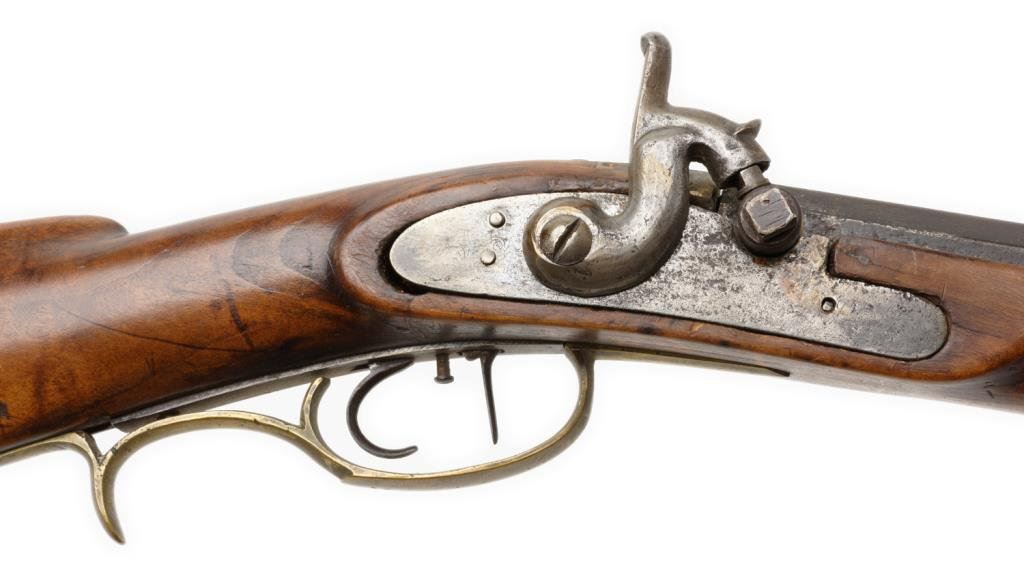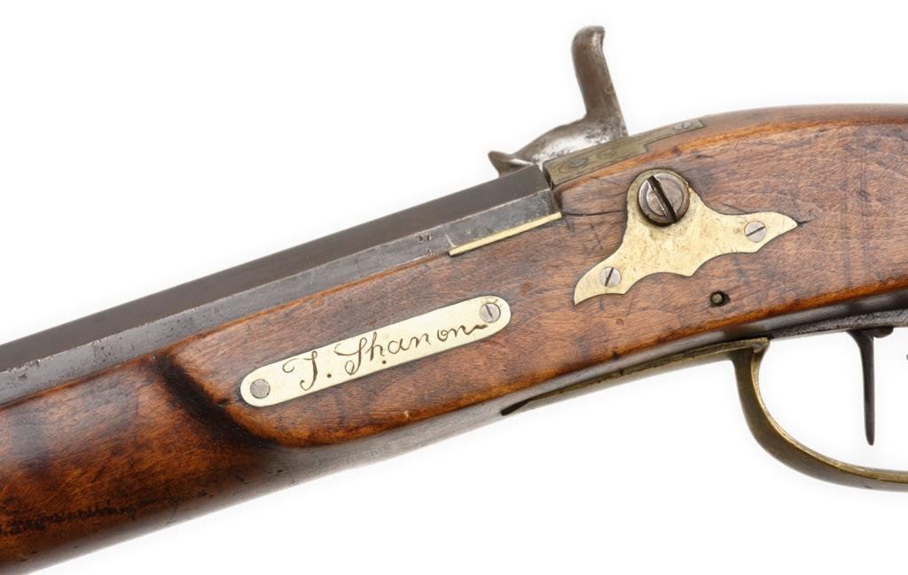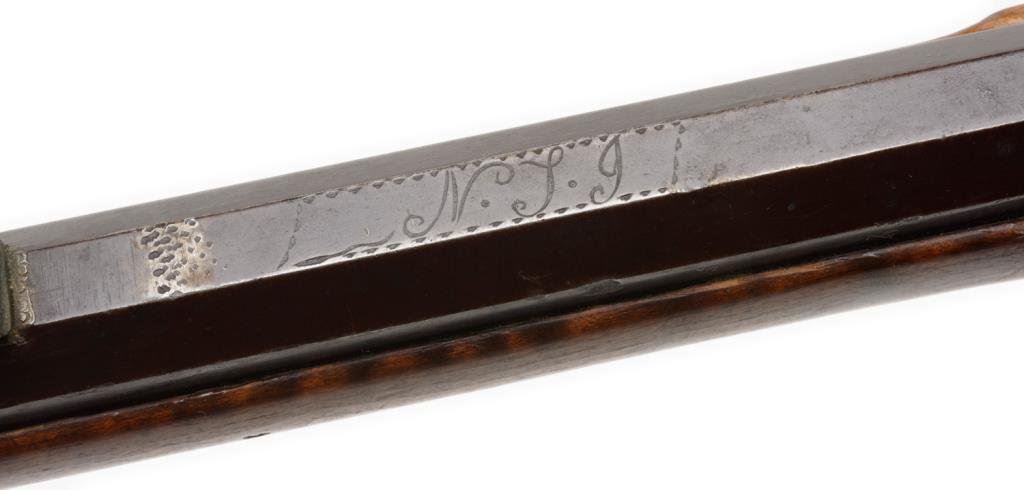 Percussion full stock rifle, .32 caliber, 38.5” octagon barrel, brass mounts and patchbox, left side inscribed “T. Shannon” on brass plaque; barrel flat hand engraved “N.T.J” (per consignor’s tag, for Nathan T. Jarvis; overall good condition with dark patina , good wood with beautiful graining and working double set triggers (at time of description). Est.: $350-$700.