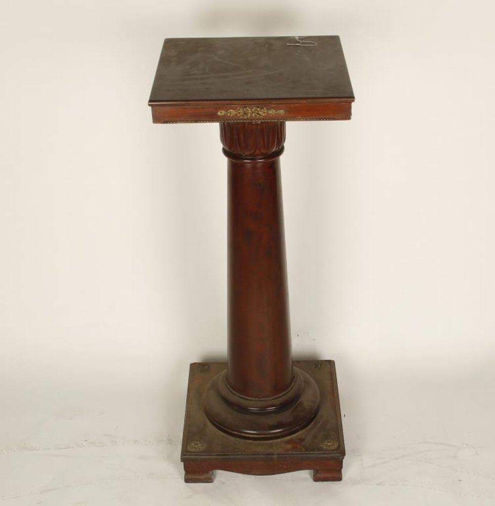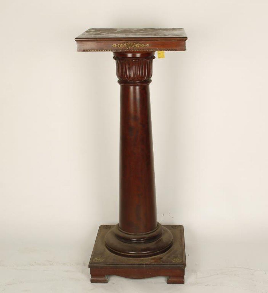 19th to early 20th Century pedestal; wood with fancy bronze accents, approximately 36.25” in height with 14.5” x 14.5” top; good condition. Est.: $600-$1,200.