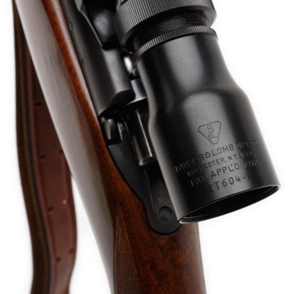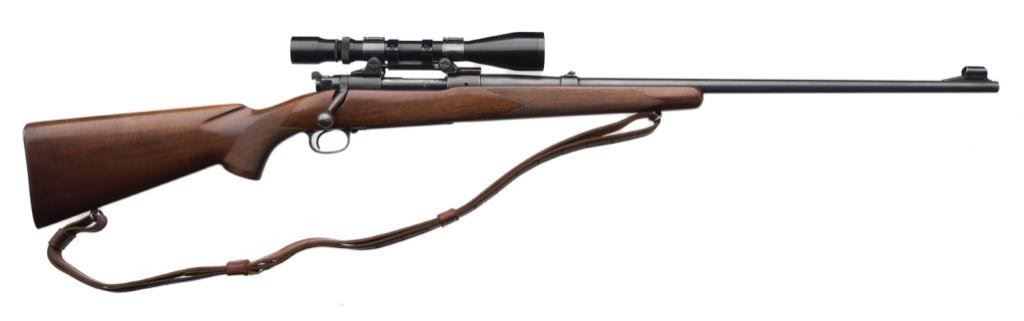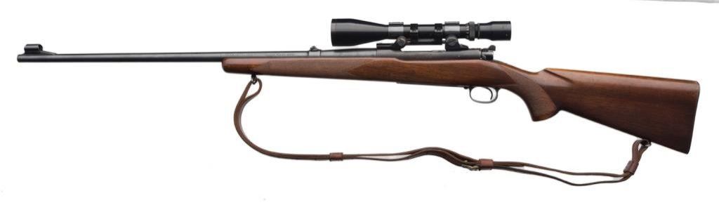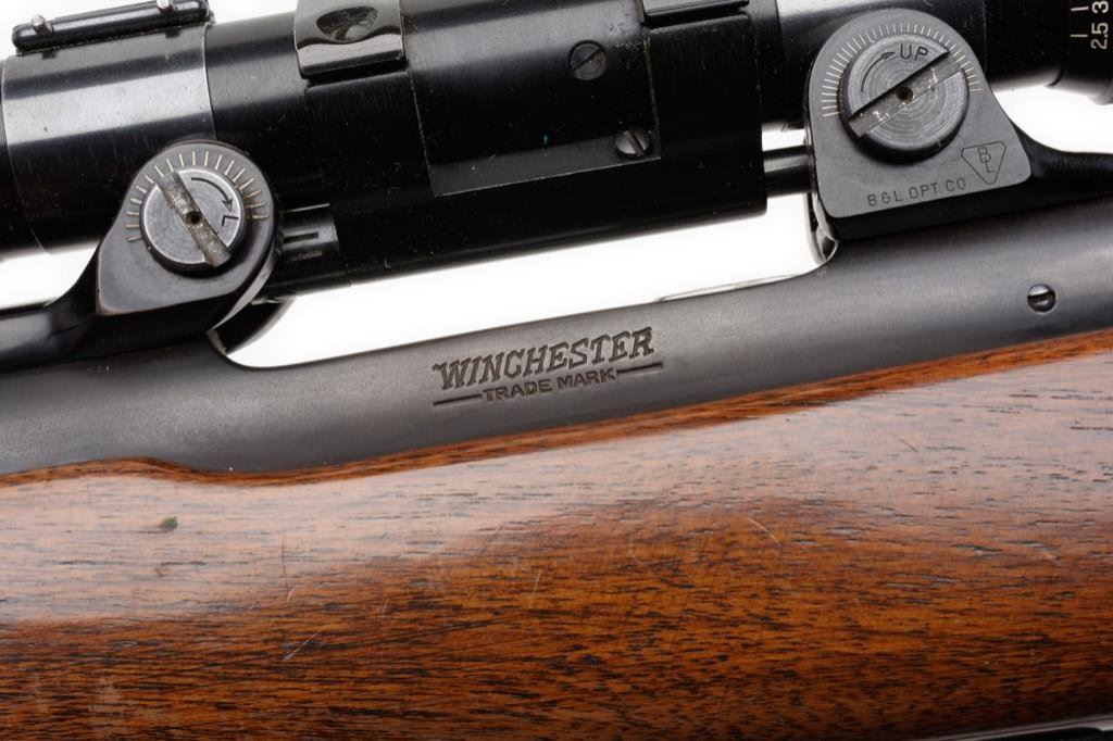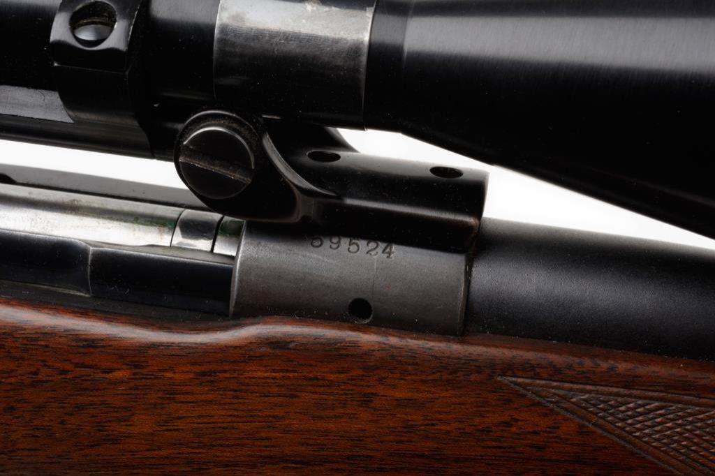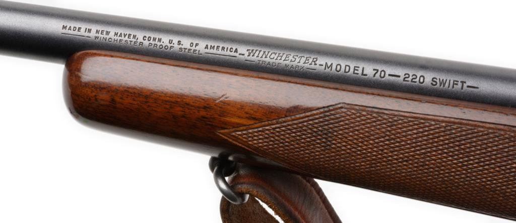 * Winchester Model 70 bolt action rifle, .220 Swift cal., serial #59524. The rifle is in overall very good condition with a 26” blued barrel. The barrel and receiver retain the majority of their thinning blued finish with some loss on the magazine plate and trigger guard. The rifle features a hooded ramp front and folding rear sights. The checkered wood stock is in overall very good condition showing small mars and compressions consistent with field use. The rifle ends with a checkered steel butt plate showing significant blue finish and includes a period leather sling. The rifle is topped with Bausch and Lomb adjustable proprietary mounts and a Balvar 8 variable power 2.5 x 8 scope. The bore is very good, the action is crisp and markings sharp. An early and desirable Model 70 in a hard to find caliber, manufactured in 1947. Est.: $700-$1,400.