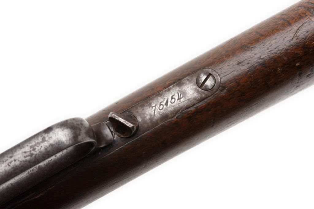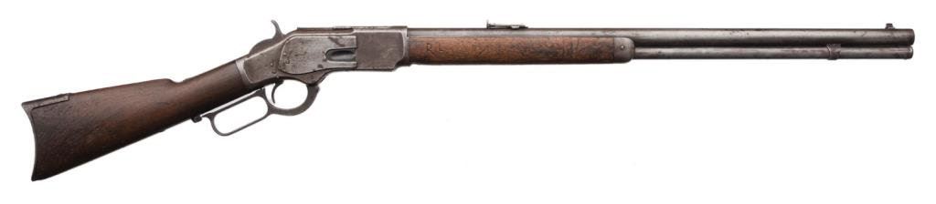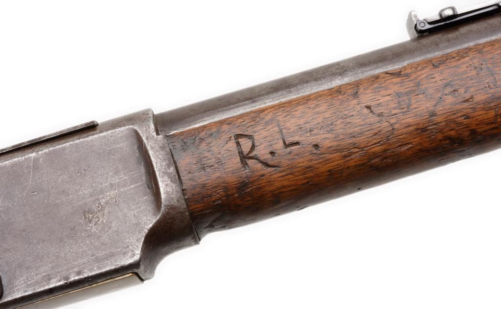 Winchester Model 1873 lever action rifle, .38-40 caliber, 24” round barrel, S/N 75154, blued finish, wood stocks with butt stock shortened; brown patina to metal surfaces with scattered spots of erosion, good action, bore may clean; wood is worn with “R.L.” initials on right side of forend. Est.: $800-$1,600.