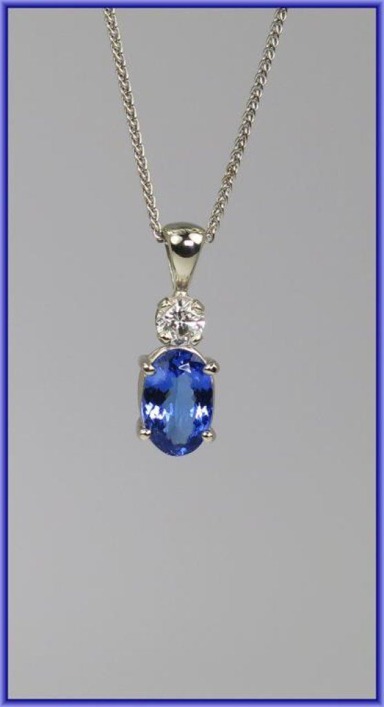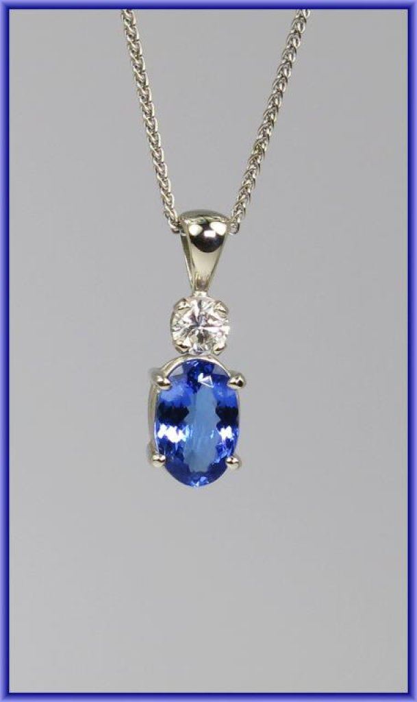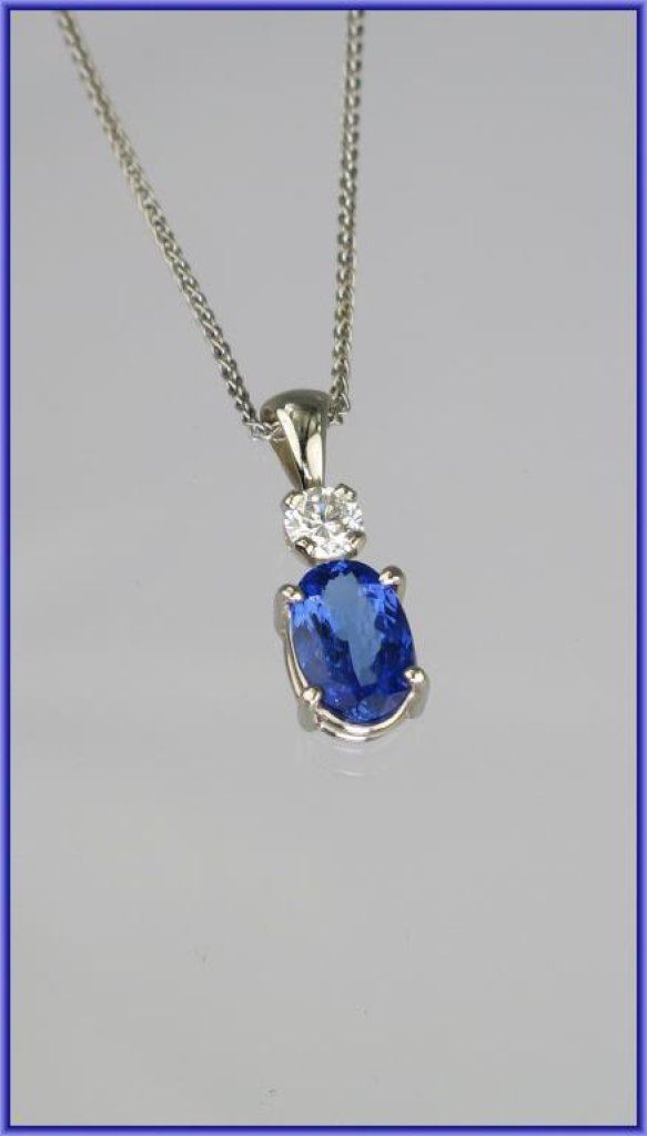 Gorgeous FINE Quality Tanzanite and Diamond Pendant featuring a 1.50 oval cut tanzanite ‘AAA’ quality with intense blue/violet color and VS clarity and round ‘IDEAL’ cut Diamond weighing 0.28 carats with F-G color and VS/SI clarity set in 14 karat white gold. High Quality - New Piece. Retail $2,000-$3,000 Estimate $1,200-$1,800