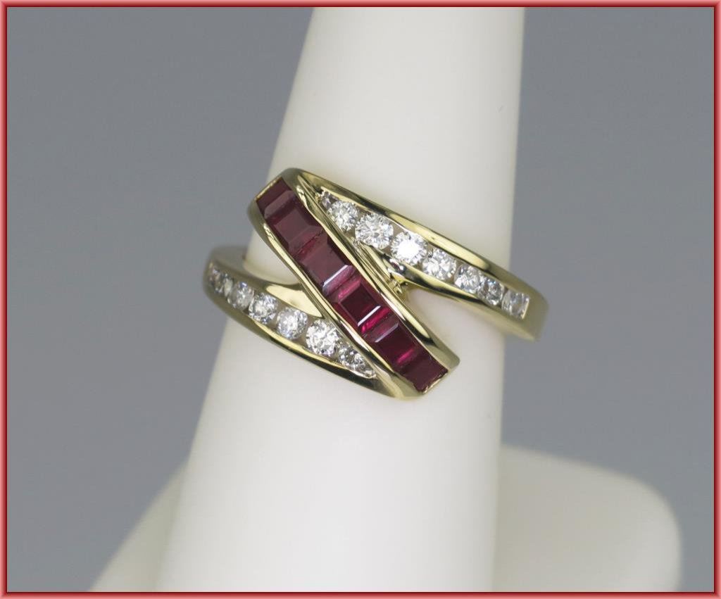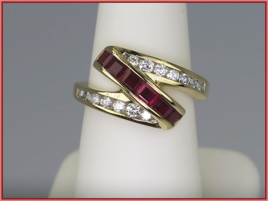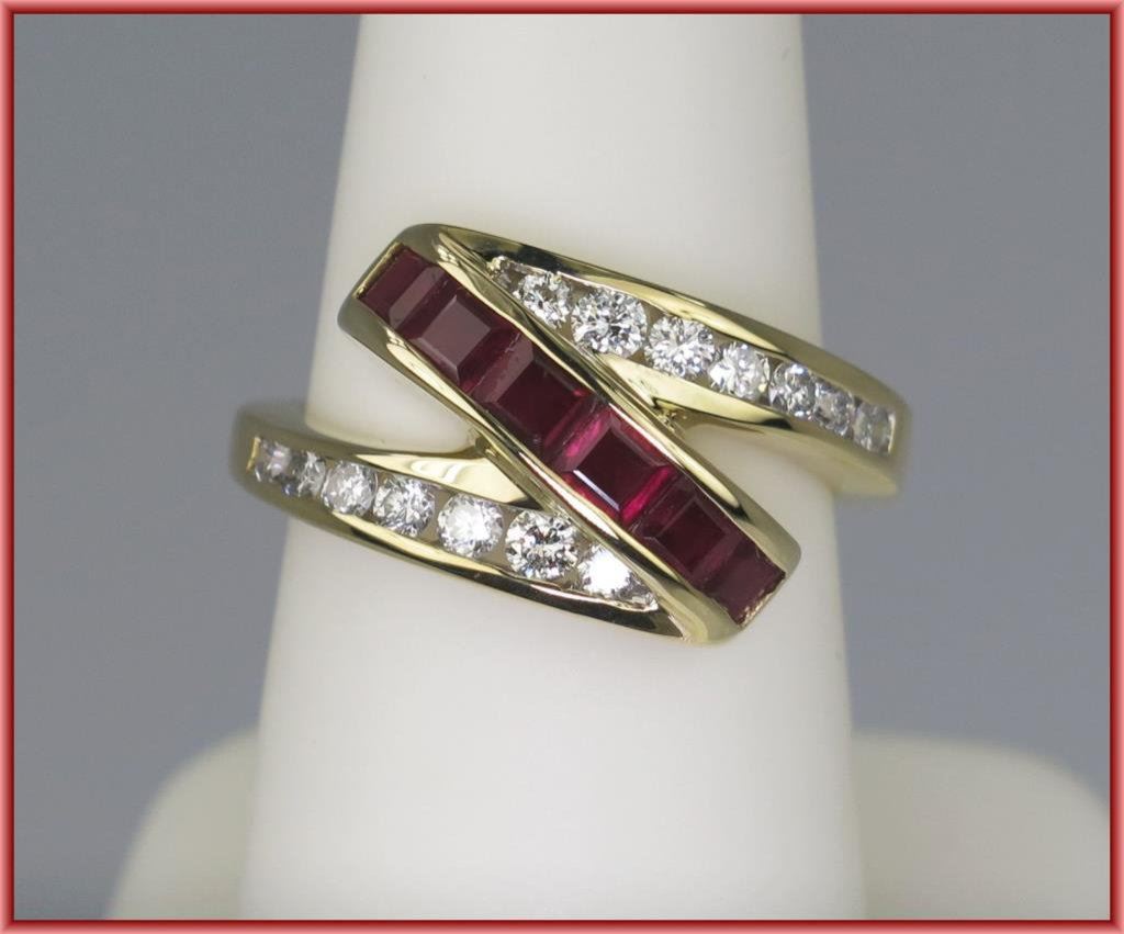 Dynamic and Vibrant Ruby and Diamond Ring in contemporary Z style design with 6 channel set princess cut rubies weighing approx. 0.60 carats and 14 round cut channel set Diamonds weighing approx. 0.50 carats with H-I colors and SI clarity set in 14 karat yellow gold. NEW Piece. Retail $1,600-$2,000 Estimate $1,000-$1,200