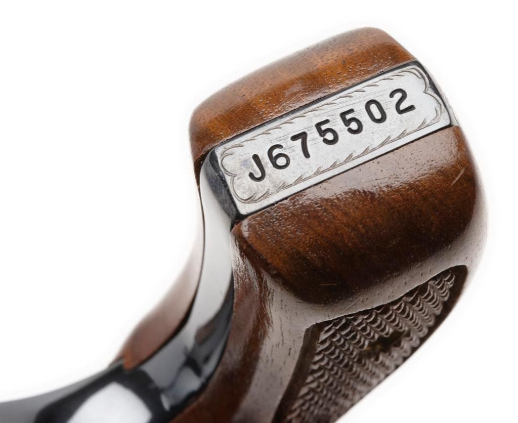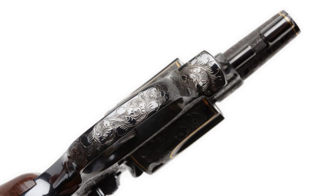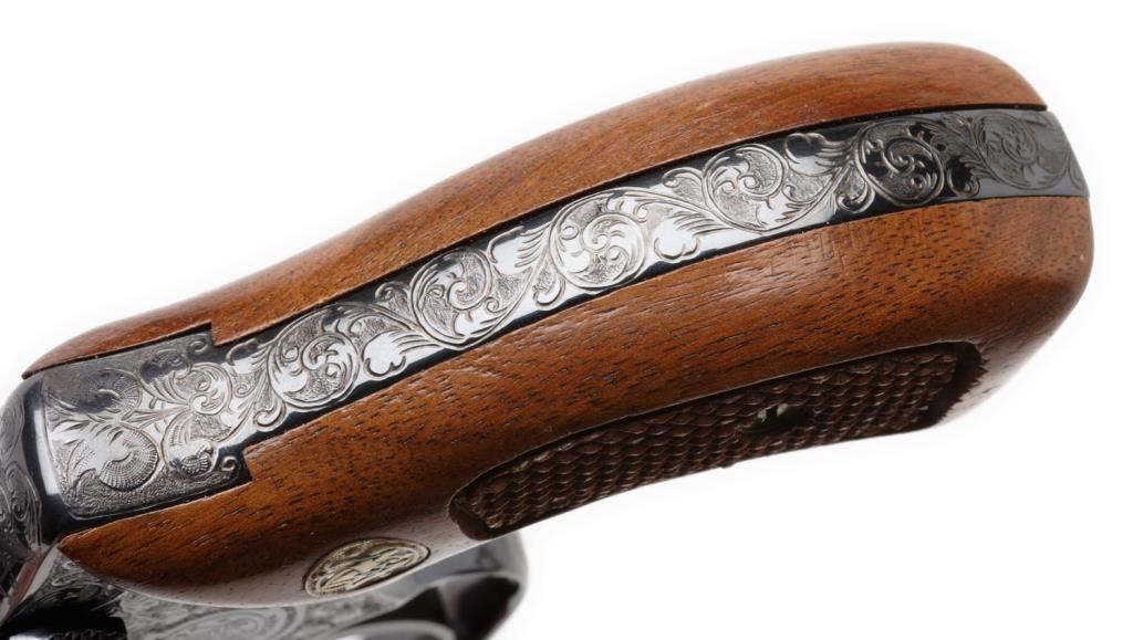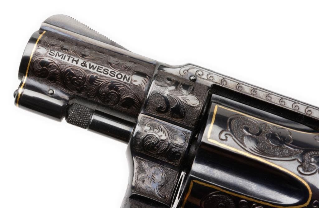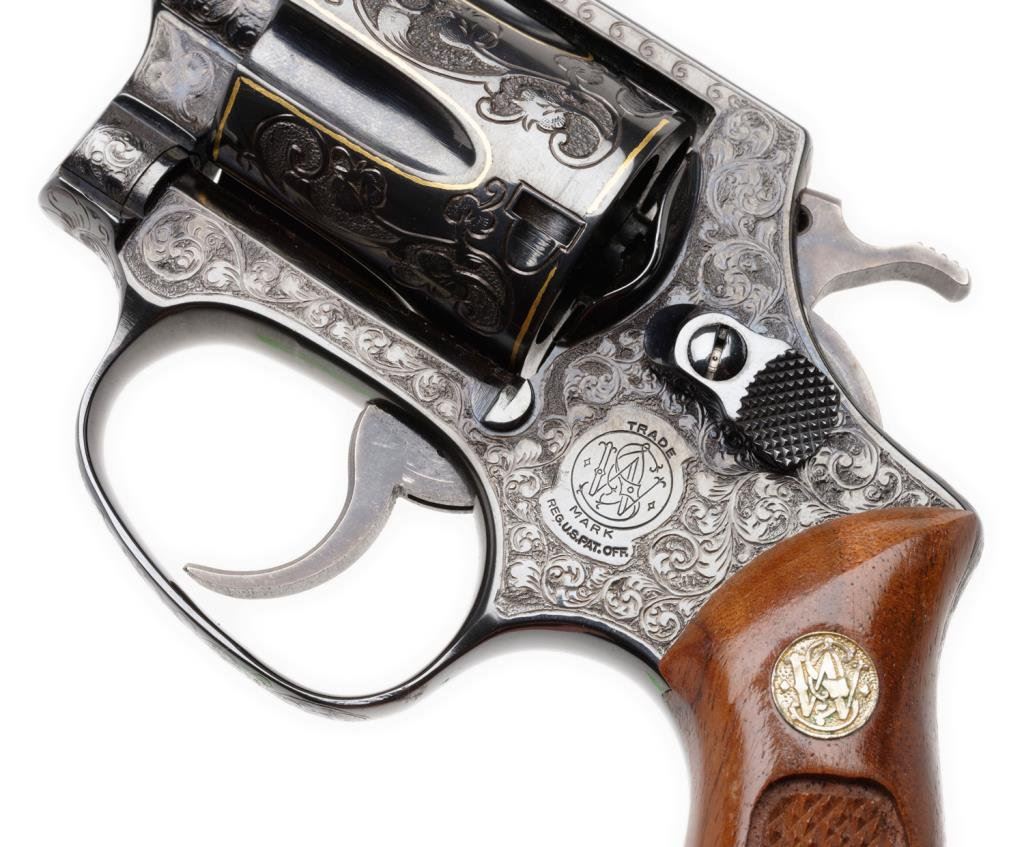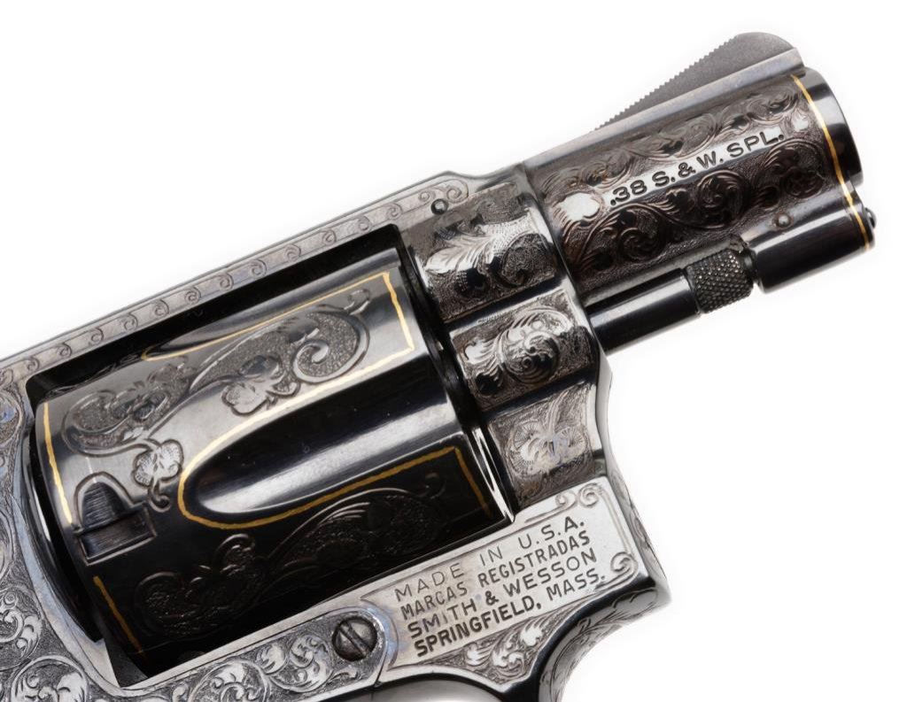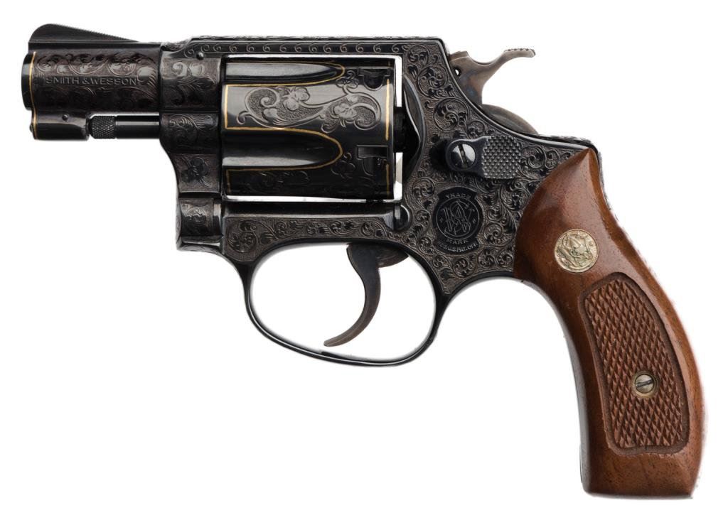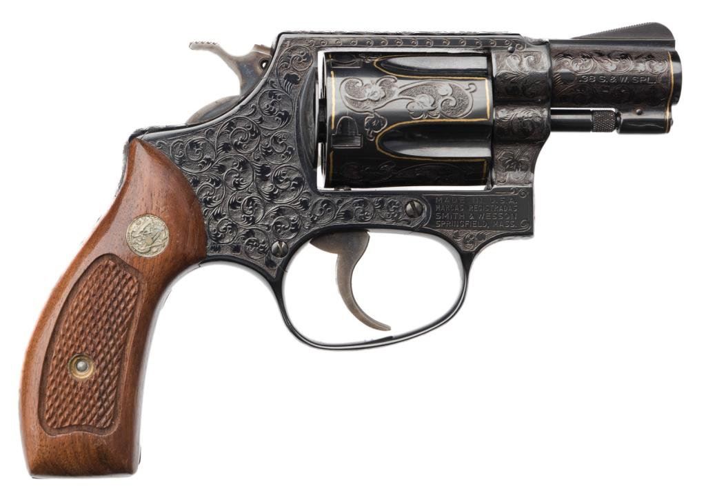 *Finely custom engraved and gold inlaid Smith & Wesson Model 36 (no dash) DA revolver, .38 Special caliber, 2” barrel, S/N J675502, checkered wood medallion grips in overall fine condition as customized with full scroll coverage and gold inlaid boardering; fine bore, crisp action, fine grips. Est.: $1,700-$3,400.