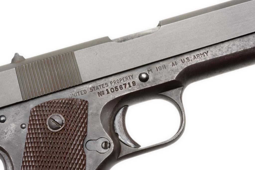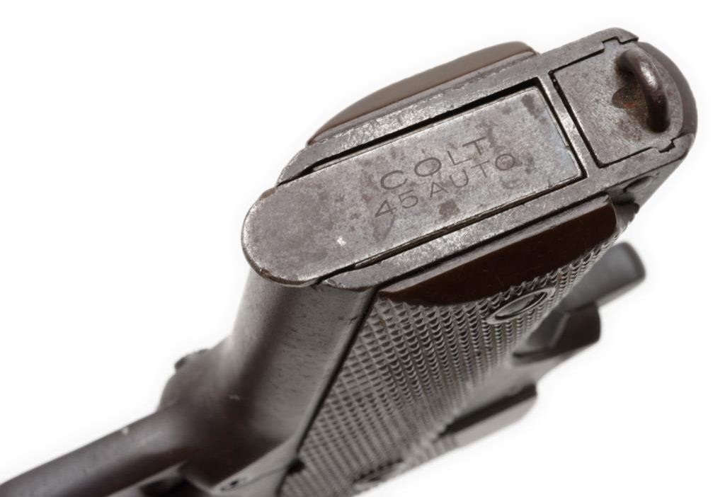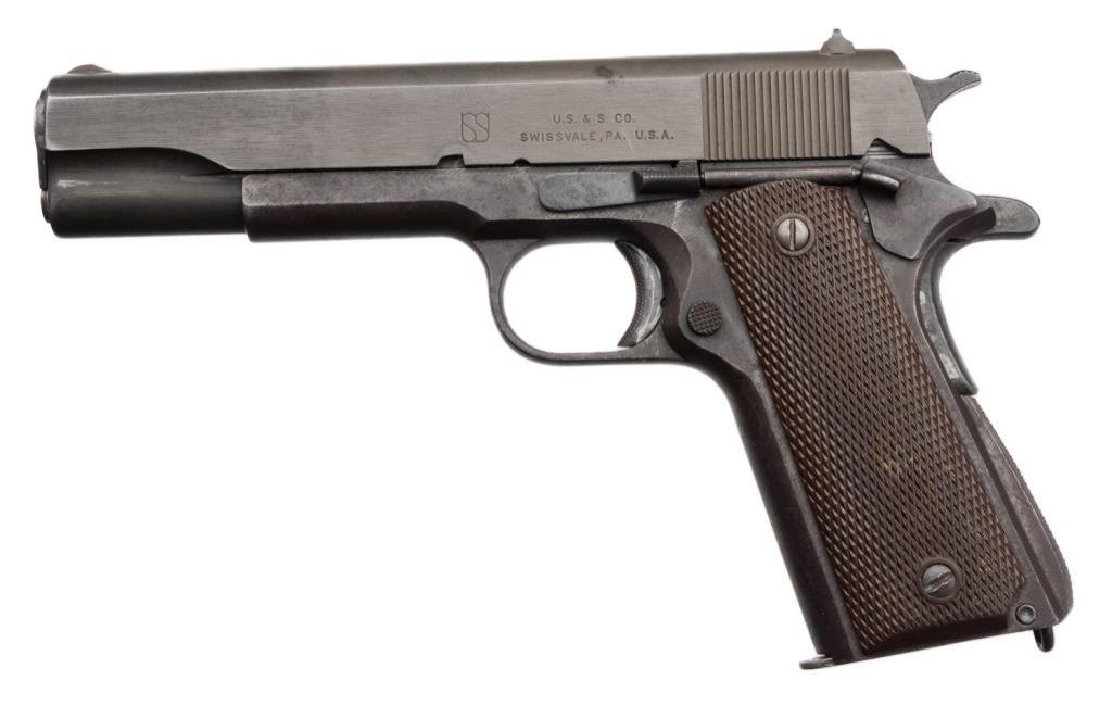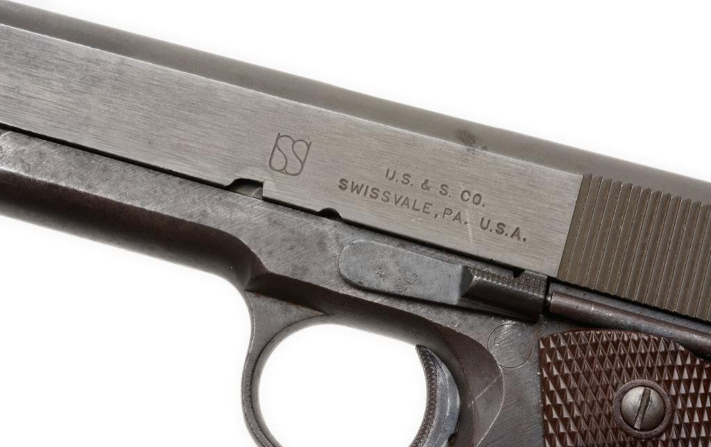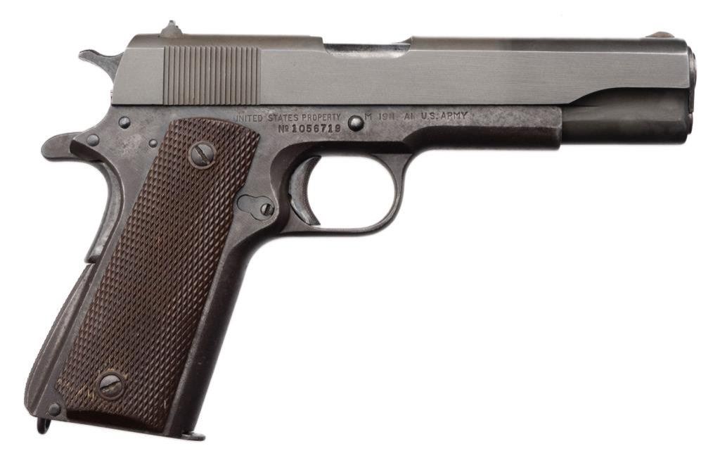 1911-A1 by Union Switch and signal, SN: 1056718. The slide is in excellent condition however the frame is somewhat mottled and seems to have seen more exposure to the elements. The frame is in the correct U.S. & S. range. Est.: $3000-$4000
