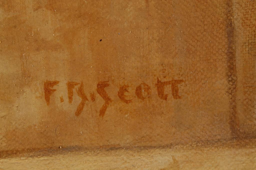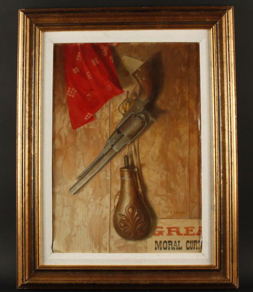 Original oil painting on artist board portraying Remington model 1858 new model revolver hanging on a board with powder flask in Western scene. The painting measures approximately 18 1/2” x 13 1/2” is nicely framed and matted. Signed lower right F. B. Scott. The condition is fine to excellent est.: $500-$1,000