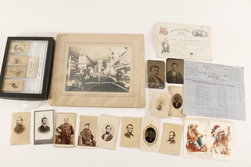 Lot of early photos, tintypes, late 1800’s bawdy lady cigarette cards, color Nebo Cigarettes silk advertisers, a Colorado Territory mining document and a large cabinet photo of the interior of a general merchandise store. From the estate of the late Joe Kiser. Est.: $200-$300.