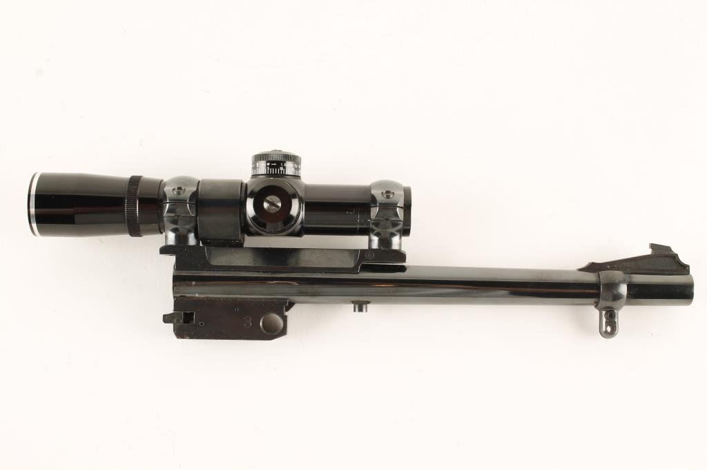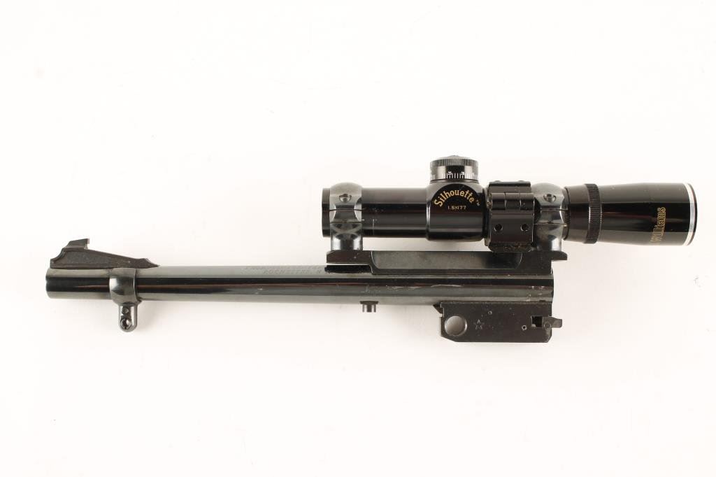 Thompson Contender barrel only in .357 Herrett caliber, 10” barrel, blued finish, with fine bore and mounted with a Silhouette 1.5X177 scope with crisp optics. Est.: $125-$250.