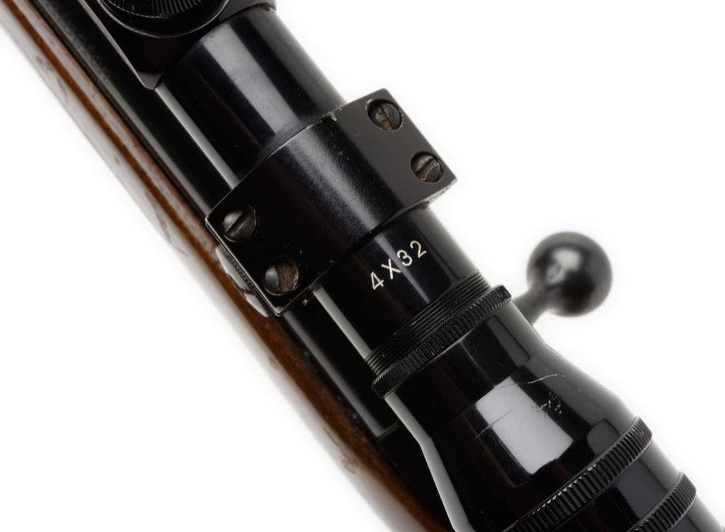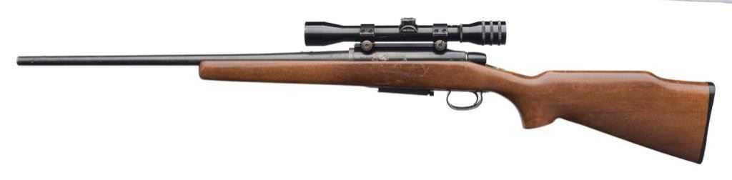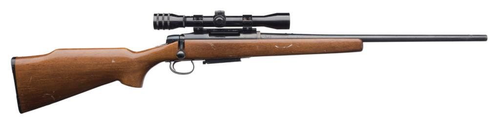 *Remington Model 788 bolt action rifle, .308 Win. caliber, 21.5” barrel, S/N 6113138, blued finish, wood stock and mounted with a Universal 4x32 scope with crisp optics; overall good to very good condition with a very good to fine bore, action needs work, one magazine, scattered spots of wear to finish and some areas of pinprick pitting; good stock; great caliber. Est.: $450-$650.