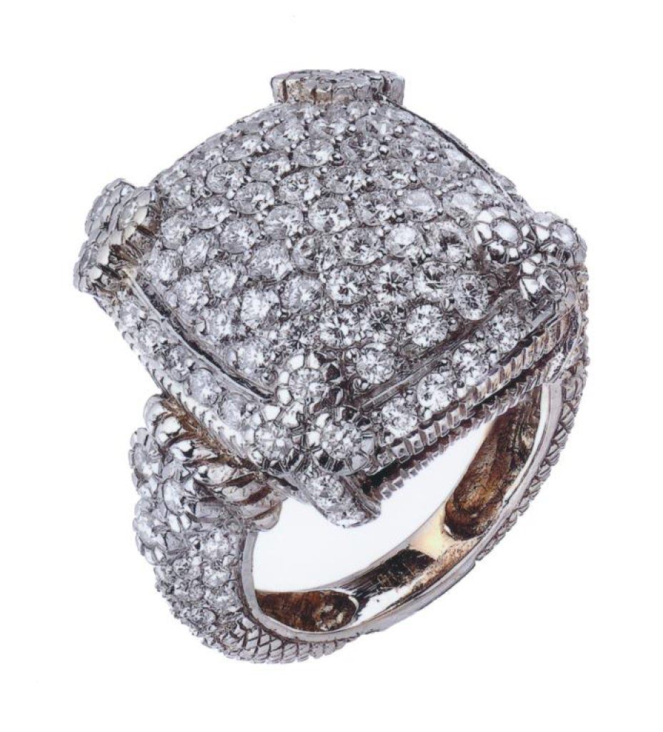 Lot 2833 18KT gold ring mounted with 3 3/4CT diamonds marked Judith Ripka, a well-k