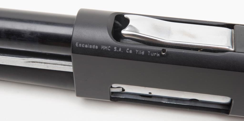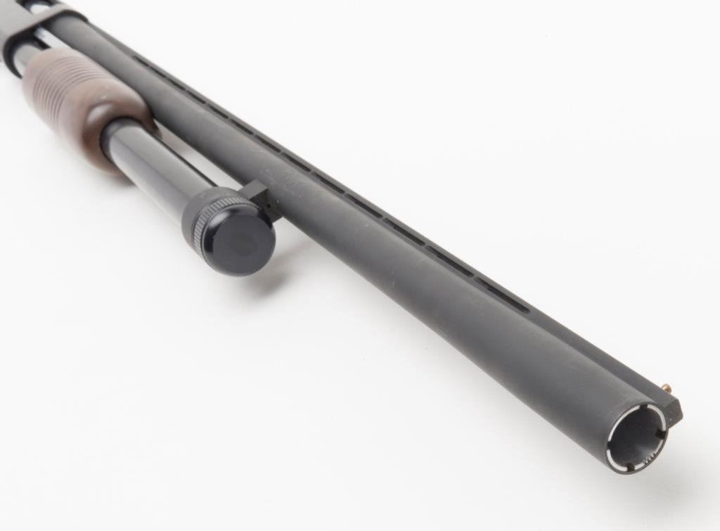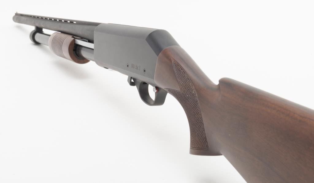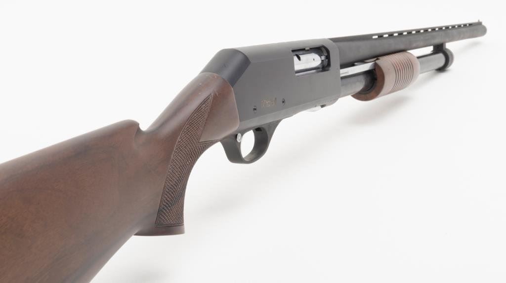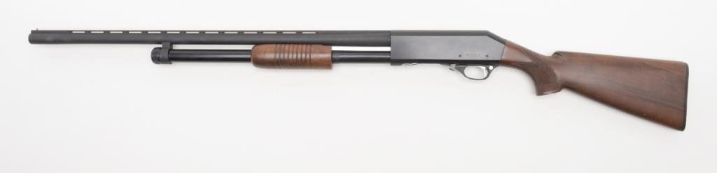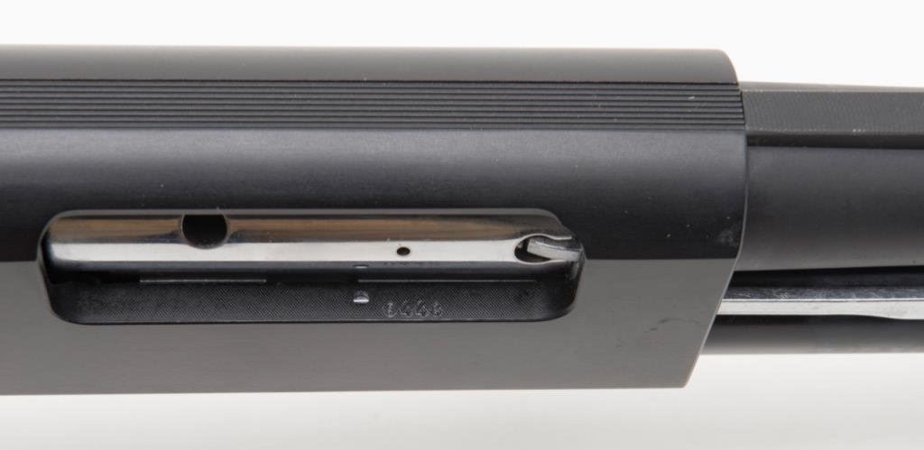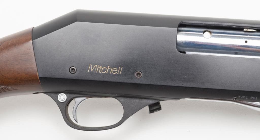 Mitchell pump action shotgun, 12 gauge, 28” ventilated rib barrel, black finish, checkered wood stock, #0448 in overall fine condition showing the majority of its original finish, fine bore, action, markings and wood. (Modern/PPT). Est.: $400-$800.