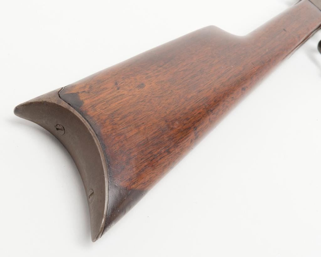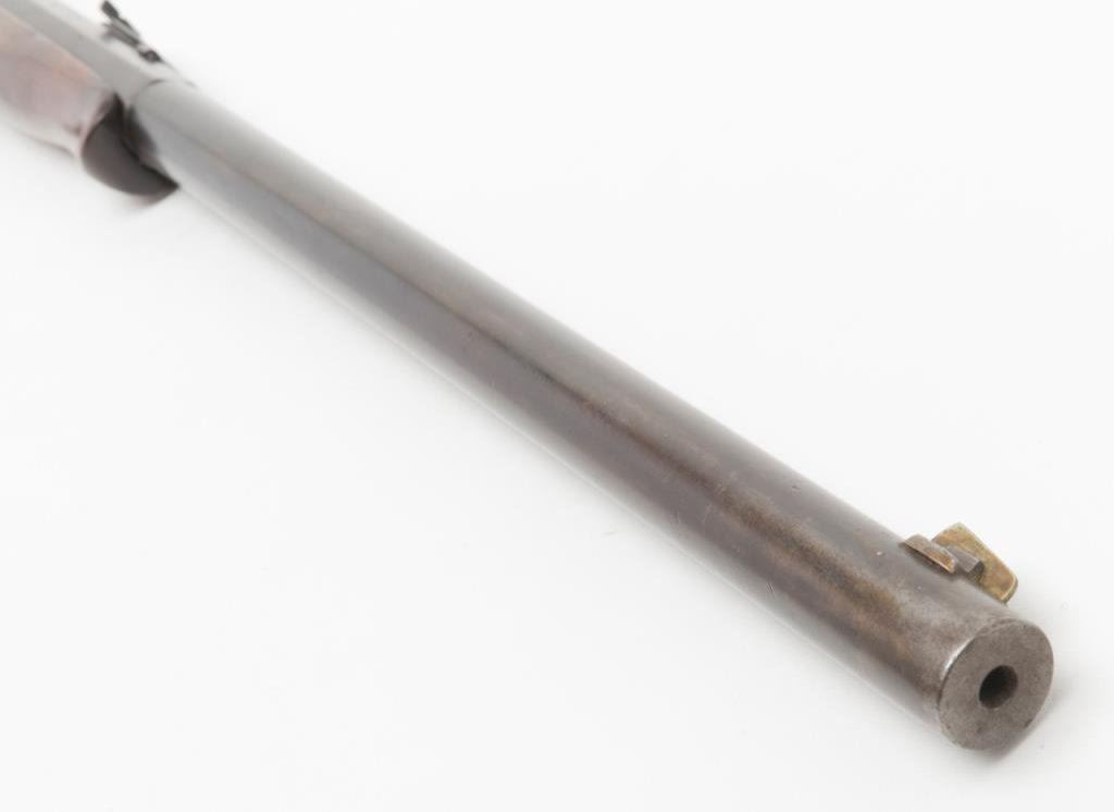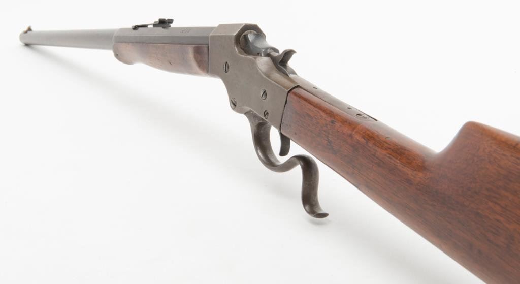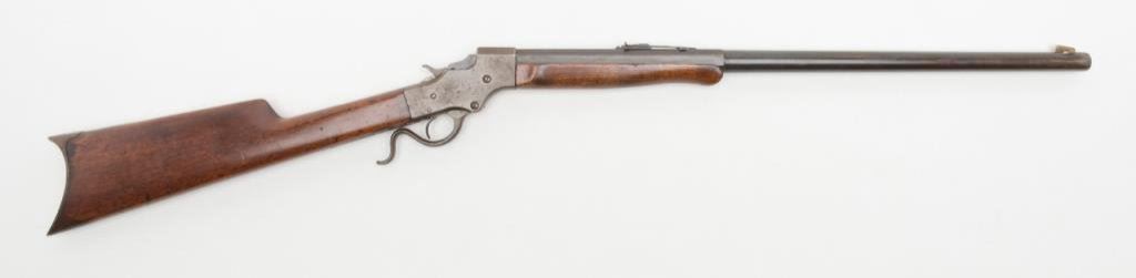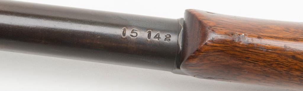Stevens Favorite falling block single shot rifle, .22 L.R. caliber, Serial #15142. The rifle is overall good condition with a 24” half round/half octagon barrel. The barrel retains a significant amount of thinning blue going to plum patina. The action has gone entirely to grey patina with a small amount of light surface rust and speckling. The smooth wood stocks are in overall good condition showing mars and scratches consistent with use and a crescent metal butt plate. The bore is fair and may clean, the action crisp and markings clear. (Antique). Est.:$200-$300.