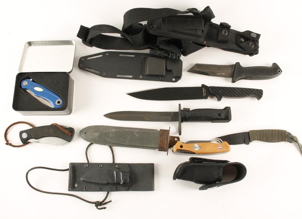 A bonanza lot of military and survival knives. The lot includes a total of seven knives including; An Eickhorn of Solingen Skipper folding knife, Wenger Mike Horn combination pocket knife with nylon sheath, Benchmade Bali-Song folding knife, CRKT Operation Enduring Freedom Special Ops knife with full nylon leg rig, Special Ops knife with corded handle and sheath, MeyerCo fixed blade Special Ops knife with Kydex sheath and a US M6 Aerial bayonet with scabbard. A fine lot of edged weapons. Est.: $300-$600.
