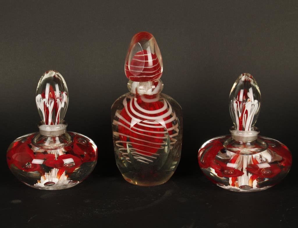 Three blown glass dresser or vanity bottles with tops; probably Italian and similar to paperweights in style. Est.: $150-$300.