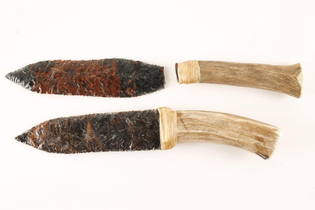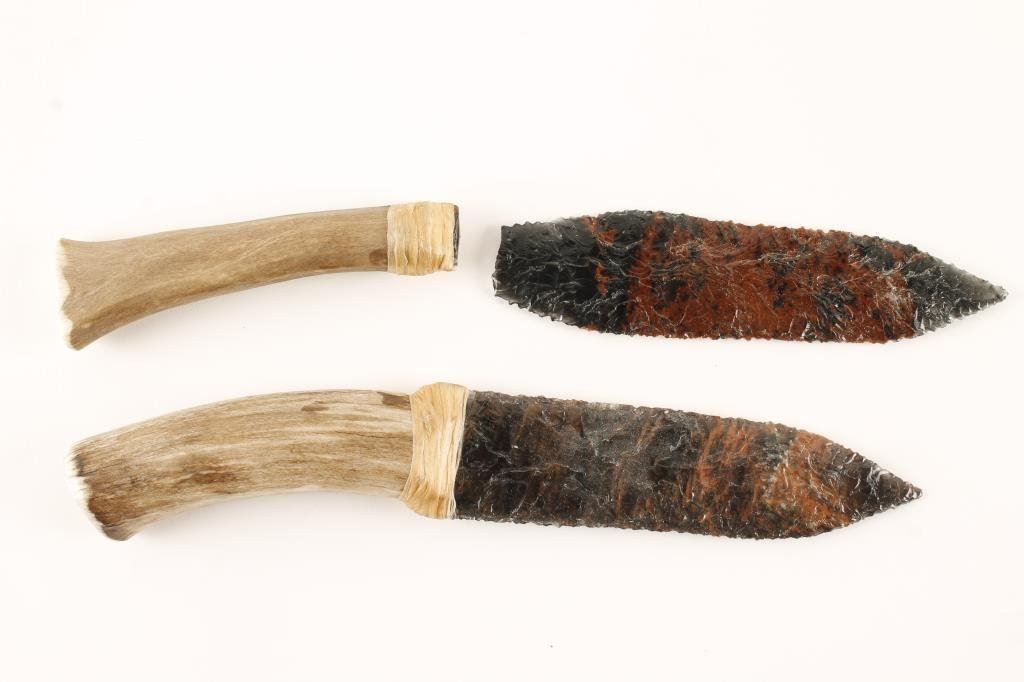 Lot of 2 modern made stone blade knives secured to antler grips by rawhide wraps, 1 broken, both approx. 12” overall and finely constructed by Klamath Indians. Est.: $200-$300.