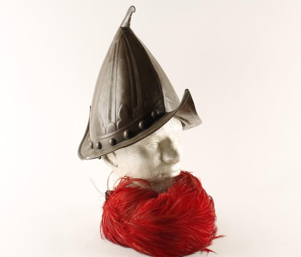 Reproduction of a cabaset helmet with red feathers. Est.: $75-$150.