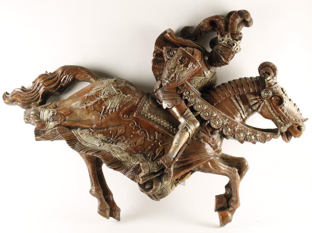 Large fiberglass wall hanging of knight on horse, approximately 47” x 33” overall; a great decorator for a game room, etc. Est.: $75-$150.