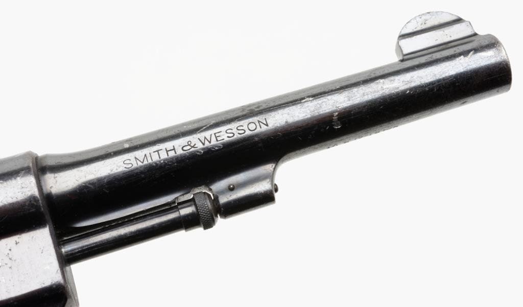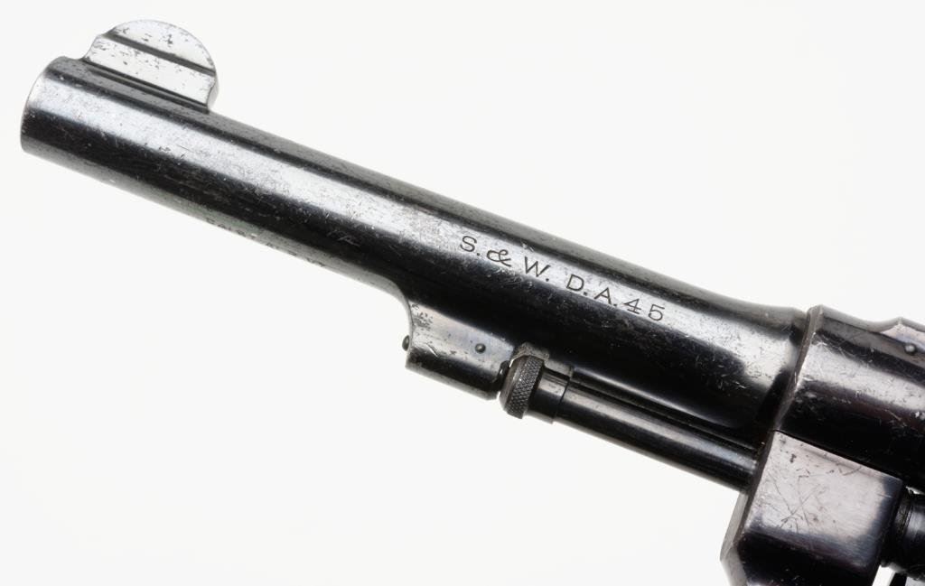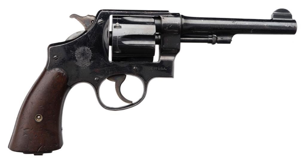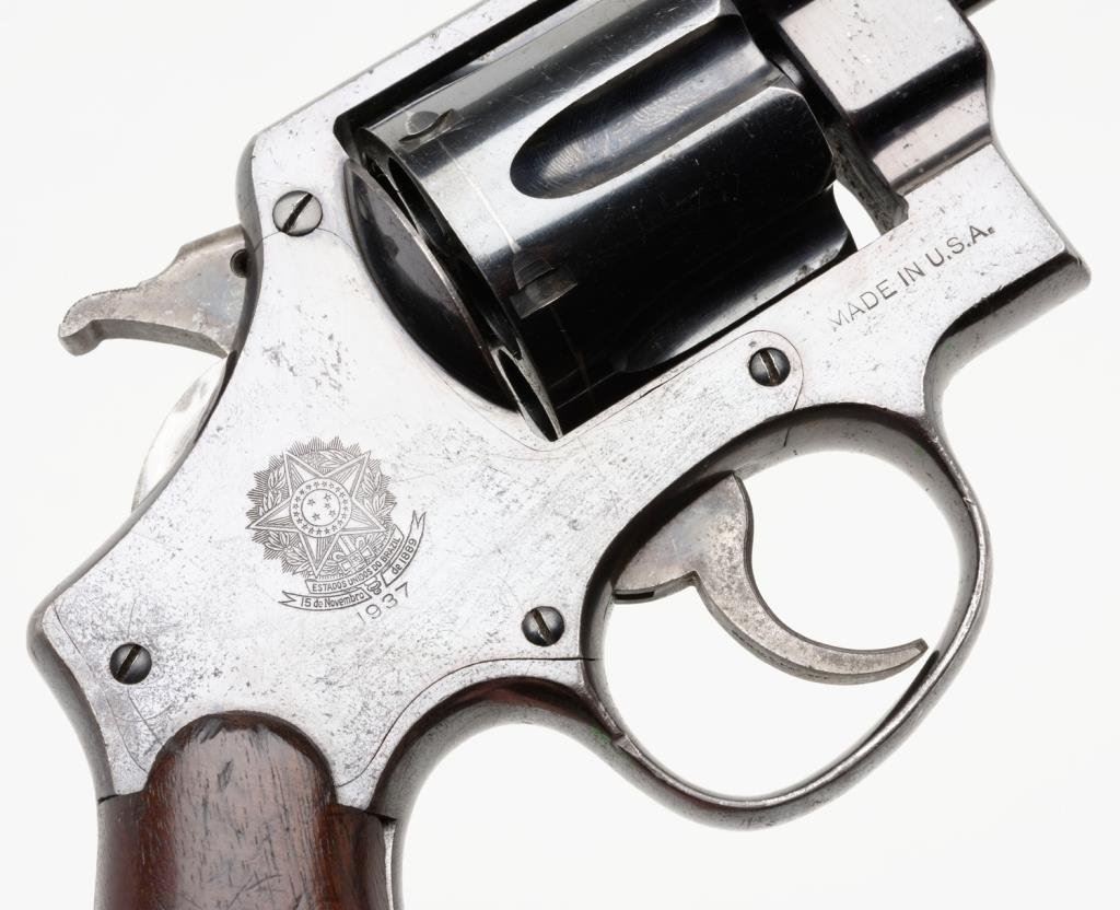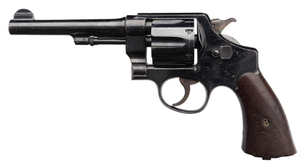 **Smith & Wesson 5-screw DA Hand Ejector with Brazilian crest on right side of frame and dated 1937, .45 caliber, 5.5” barrel, S/N 199313, blued finish, checkered wood medallion grips with lanyard ring; overall very good to fine condition showing a fine bore, crisp action and very good grips. Est.: $400-$800.