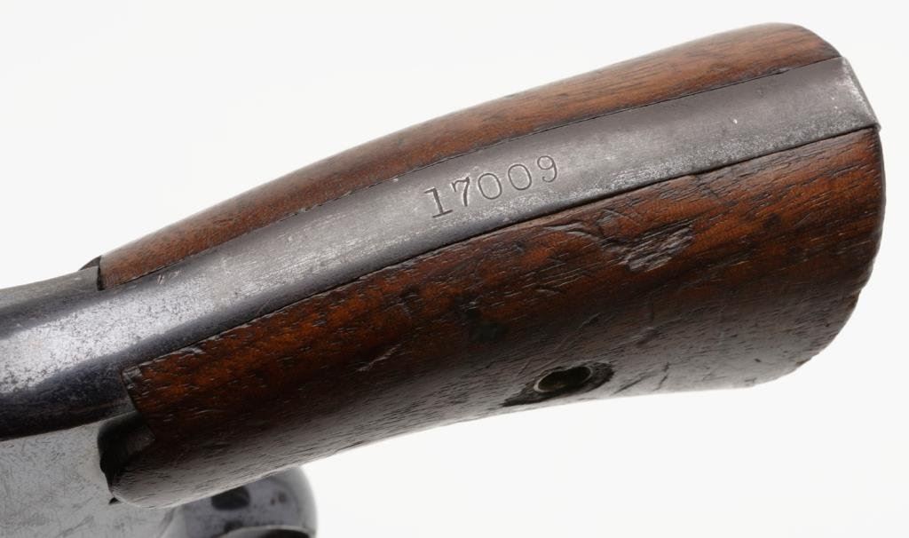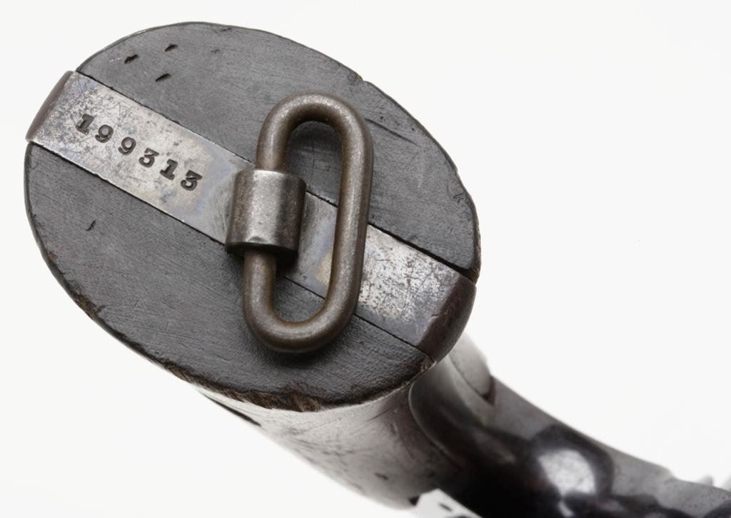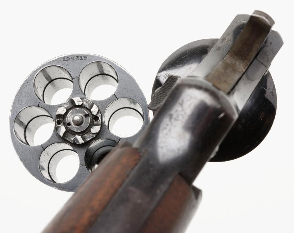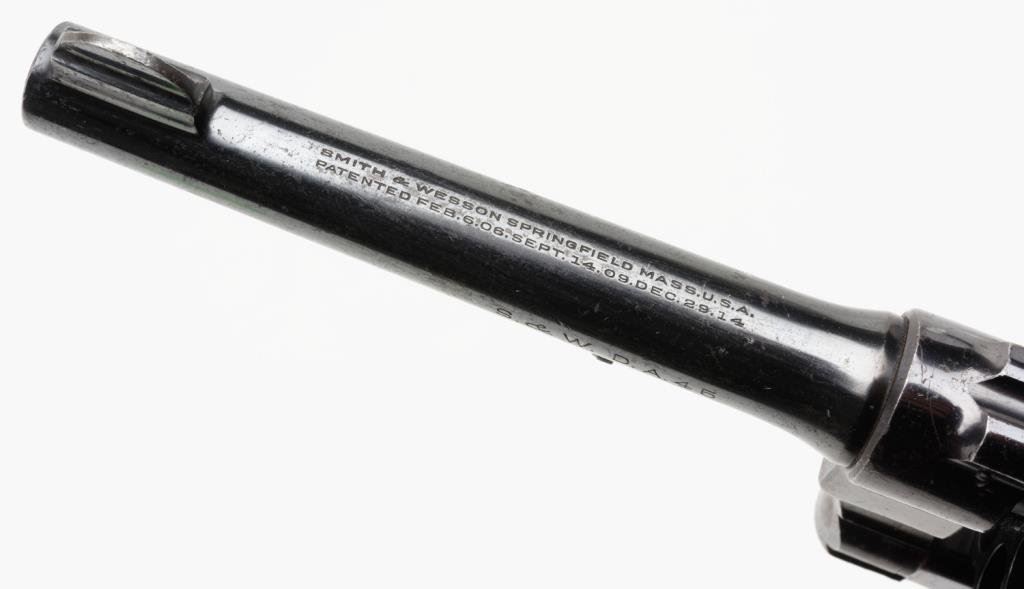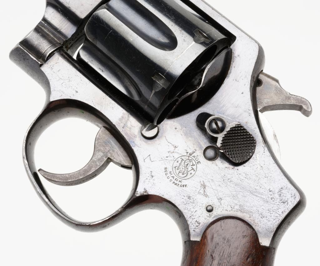 **Smith & Wesson 5-screw DA Hand Ejector with Brazilian crest on right side of frame and dated 1937, .45 caliber, 5.5” barrel, S/N 199313, blued finish, checkered wood medallion grips with lanyard ring; overall very good to fine condition showing a fine bore, crisp action and very good grips. Est.: $400-$800.