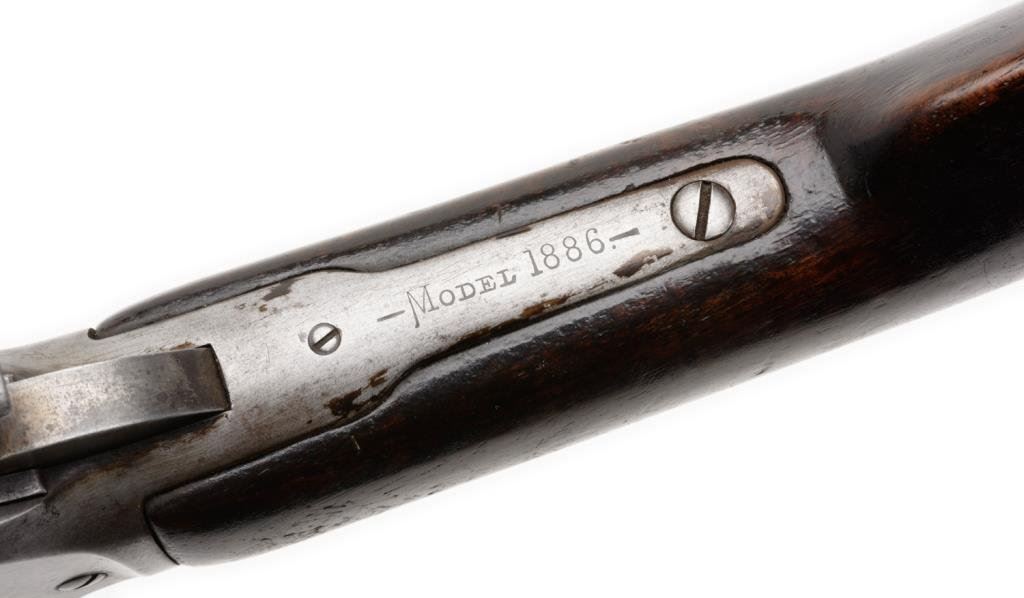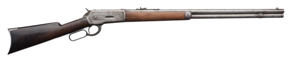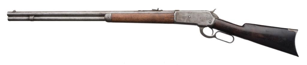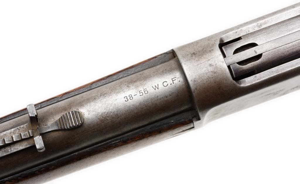 Winchester Model 1886 lever action rifle, .38-56 W.C.F. caliber, 26” round barrel, S/N 125335, grey patina, wood stocks in overall good condition showing an old cleaning, good bore, crisp action and markings; good wood with scattered old wear, scratches and marks. Est.: $1,000-$2,000.