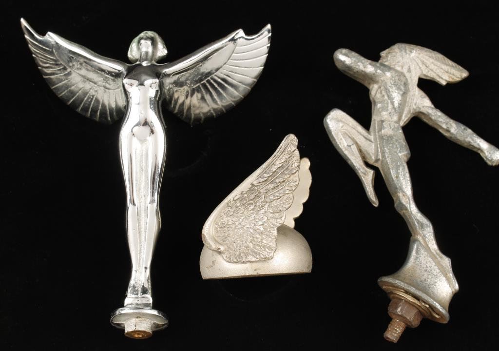 Lot of 3 vintage hood ornaments including a Running Brave ornament, ca 1920’s, possibly Pontiac; a large-winged goddess ornament ca 1930’s and a winged Viking helmet-style hood ornament for a 1930 Chrysler in very good condition. Est.: $400-$800.