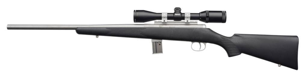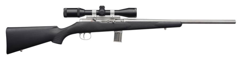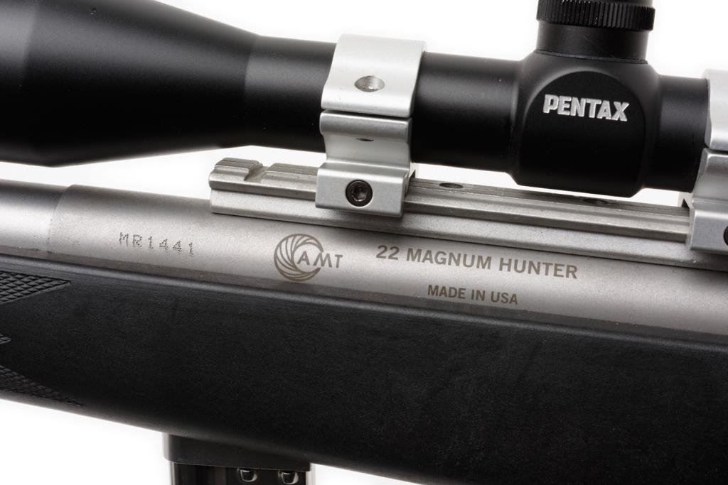 *AMT 22 Magnum Hunter Model semi-automatic magazine fed rifle, .22 Magnum caliber, 20.25” barrel, S/N MR 1441, brushed stainless finish, checkered composite stock, mounted with a Gameseeker 4-12X40 scope with good optics; overall very good to fine condition. Est.: $350-700.