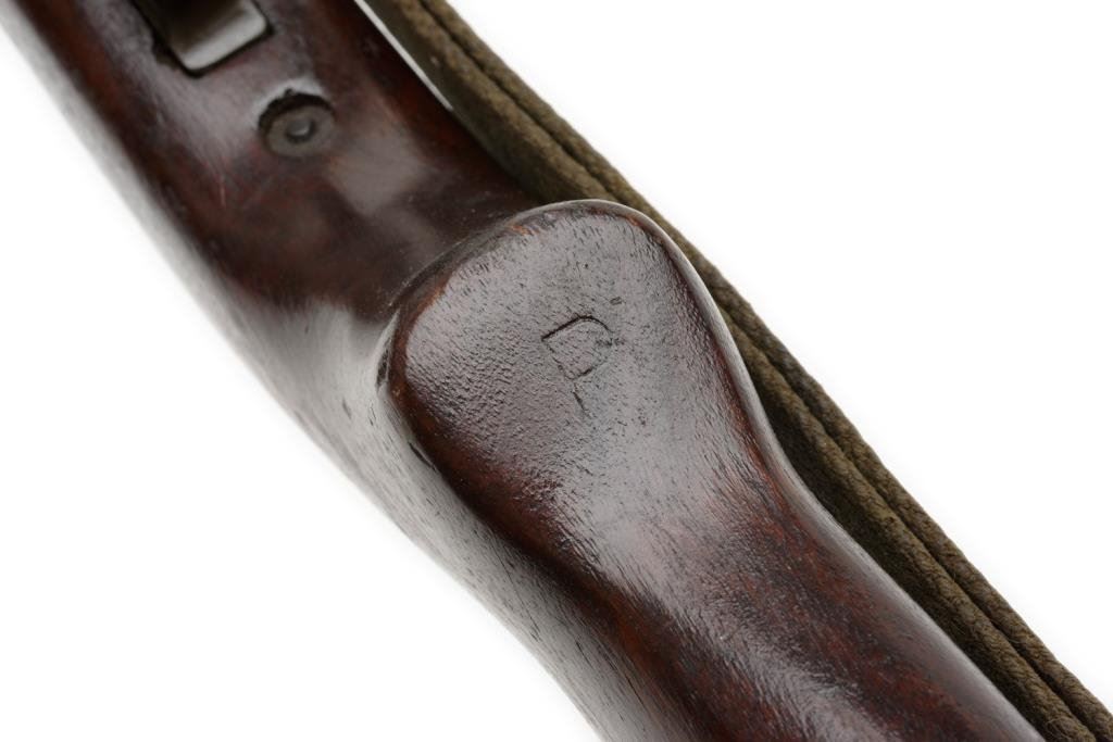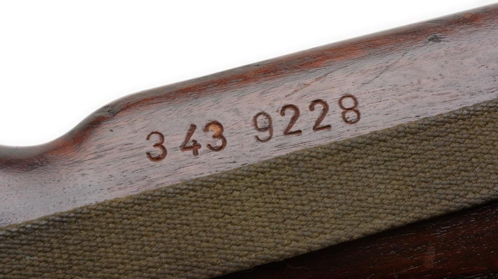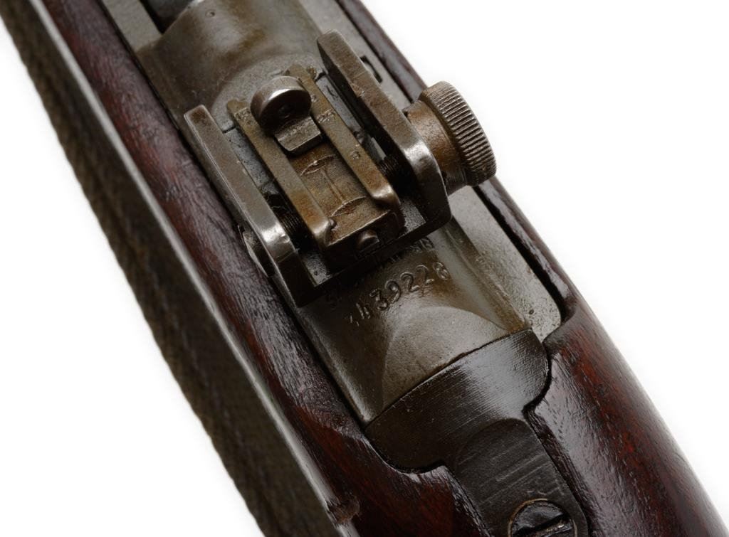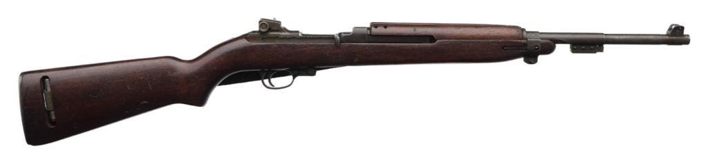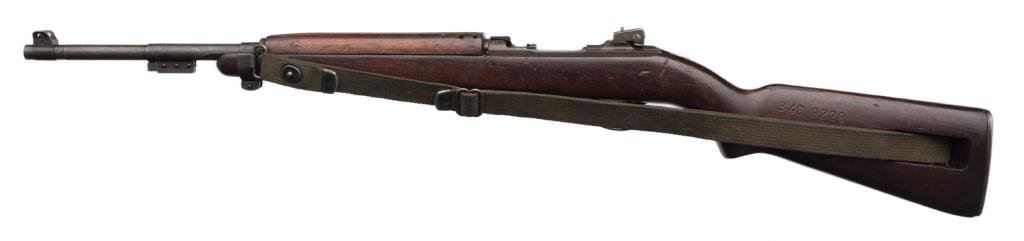 **U.S. M1 semi-automatic carbine by Saginaw S G, .30 caliber, 18” Saginaw S G barrel, import-marked, S/N 3439228, no magazine, military finish, wood stock, woven sling; overall good with good bore, action, markings and wood showing “3439228” stamped on the left side of the butt stock, “P” proof on base of semi-pistol grip and OG cartouche on right side of butt stock. Est.: $350-$700.