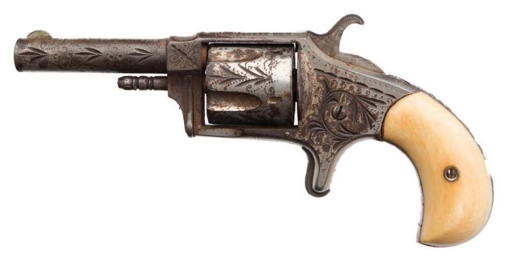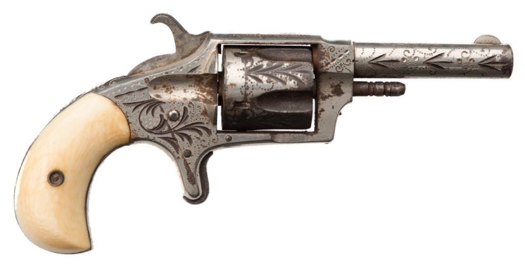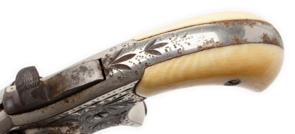 Hopkins & Allen Blue Jacket No. 2 spur trigger engraved revolver, .30 caliber, 2.75” round barrel, S/N 3860, nickel finish, period ivory grips in overall un-cleaned good condition; action needs work. Est.: $150-$300.
