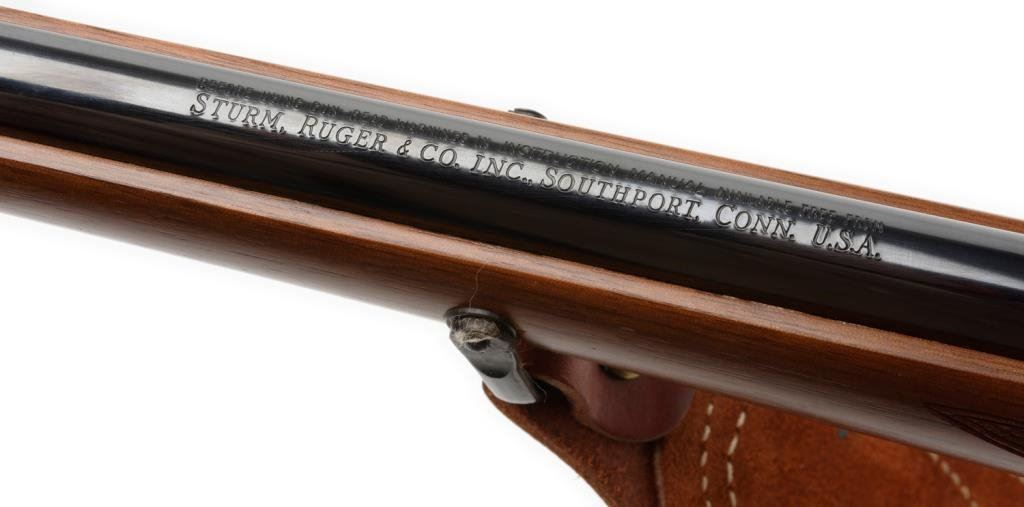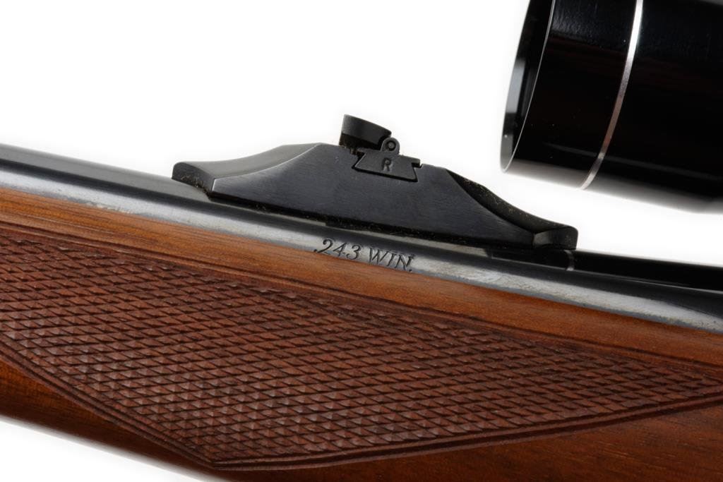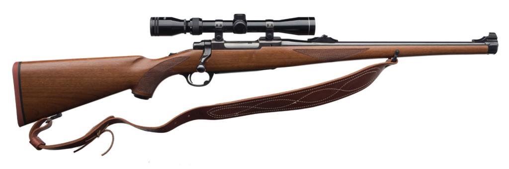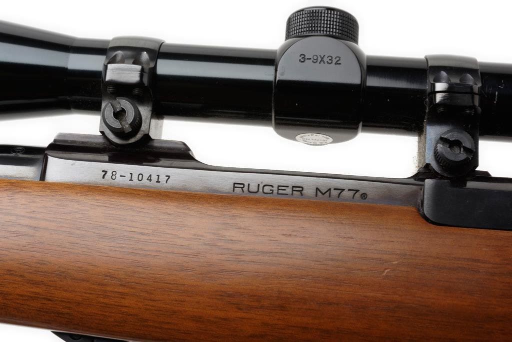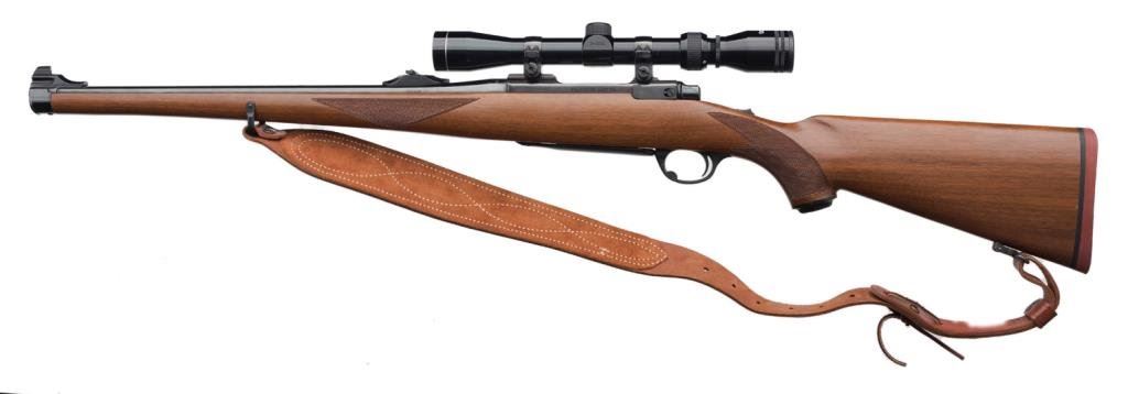 *Ruger Model 77 Mannlicher stocked bolt action rifle, .243 Winchester cal., serial #78-10417. The rifle is in overall very good condition with a 19” barrel with ramp front and folding rear sights. The barrel and receiver retain nearly all of their high gloss original blue. The checkered wood mannlicher stock is in overall very good condition as well with small mars and scratches consistent with storage, sling swivels with leather sling and a red rubber Ruger marked butt pad. The bore is very good, the action crisp and markings sharp on this desirable Model 77. The rifle is topped with Ruger rings and a Tasco 3x9x32 variable power scope with clear, crisp optics. Est.: $350-$700.