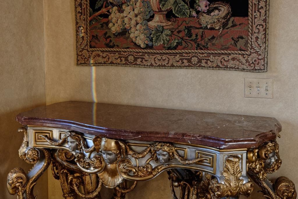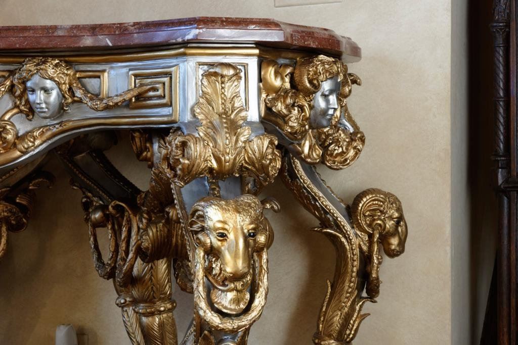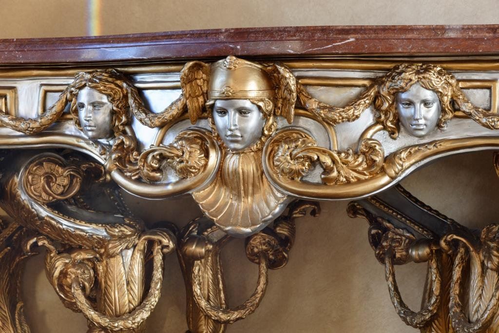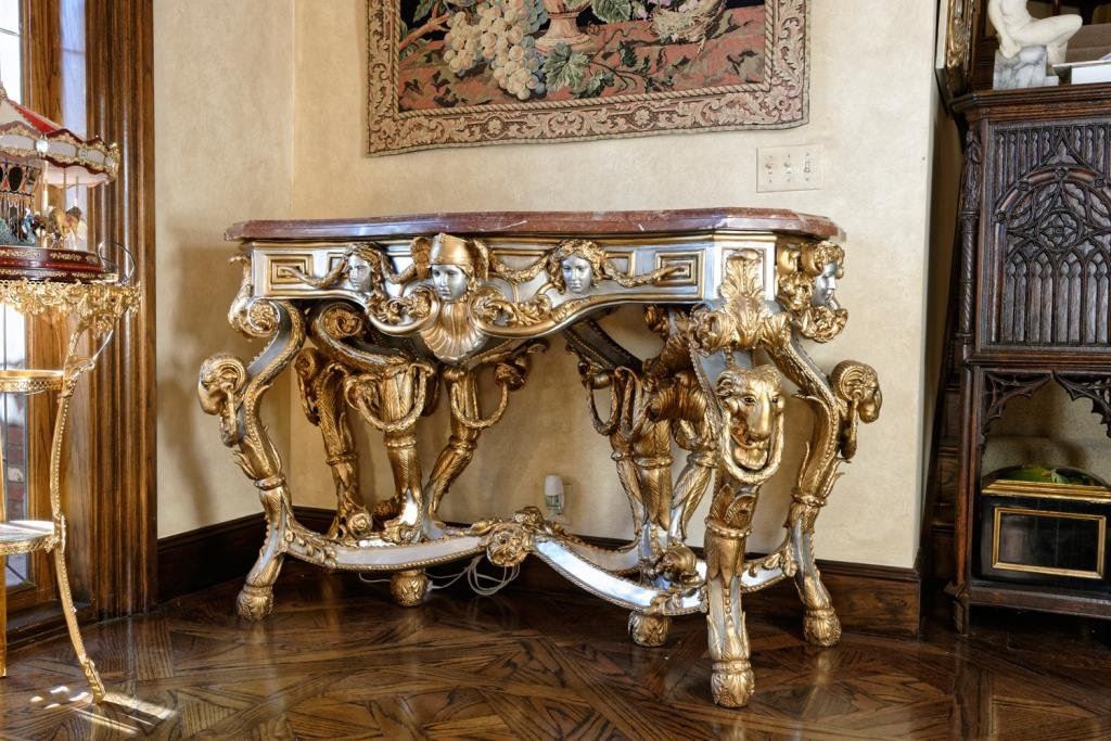 Solid metal high art table mounted with marble from Johnny Versache estate sale. Measures 39 1/2" x 60" x 27" deep. Weighs approximately 500-700 lbs. Est.: $2500-$5000