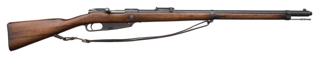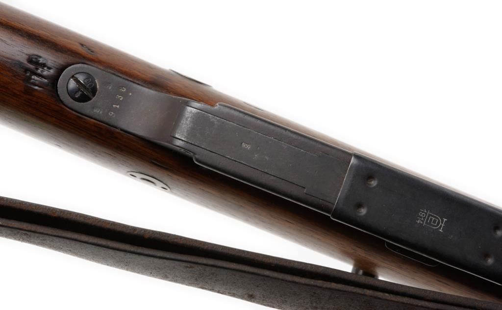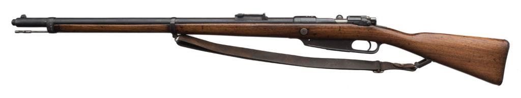 Danzig Mauser Model 88 (1890 dated); bolt action rifle, 8mm caliber, 30” barrel, S/N 2661/2951, blued finish, wood stock, leather sling; overall very good condition with good bore and action. Est.: $200-$400.