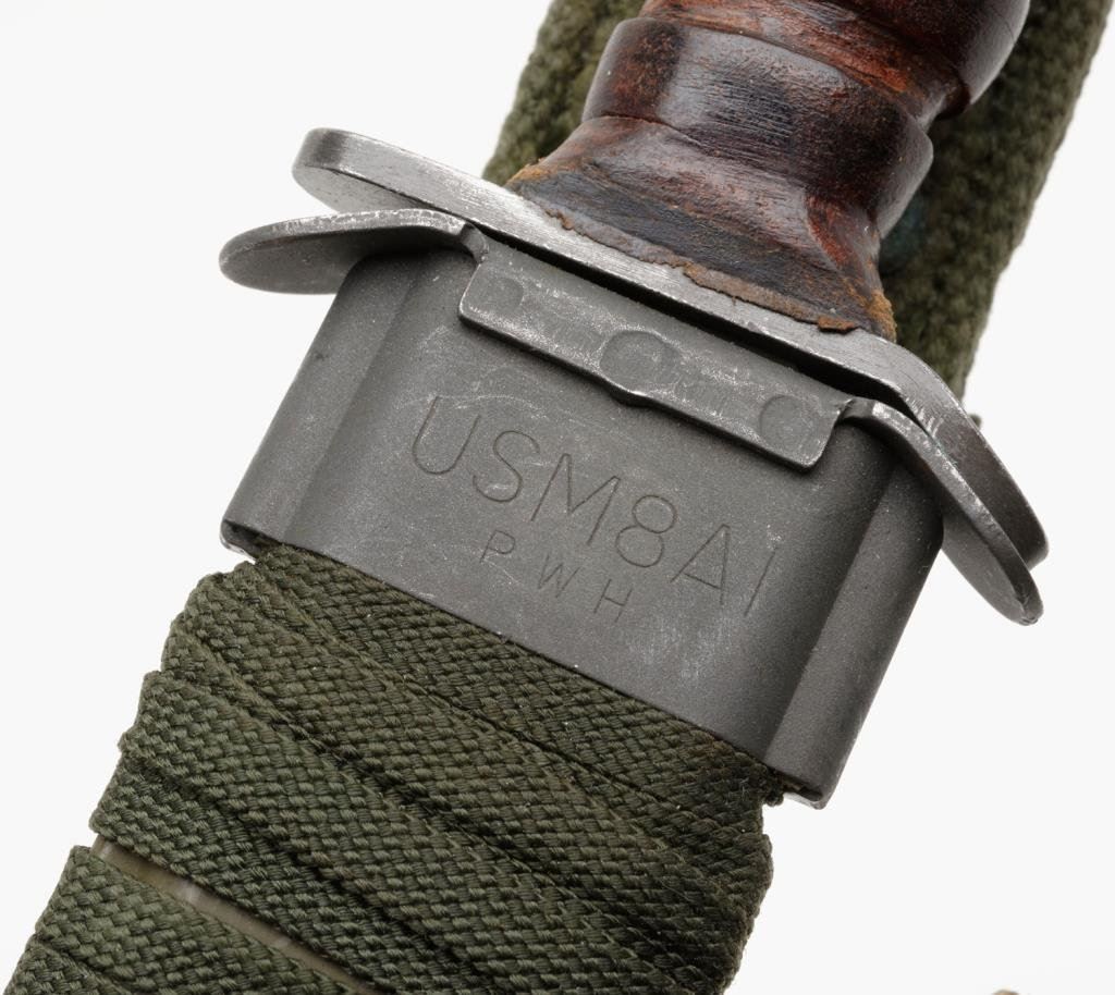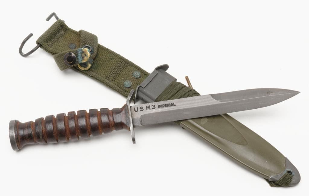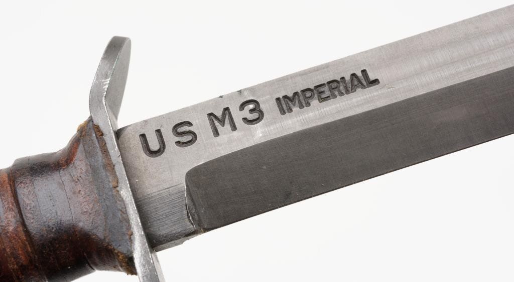 U.S. fighting knife with stacked leather grip and with sheath and woven hanger in overall very good to fine condition by Imperial and marked on the blade “US M3 IMPERIAL”. Est.: $400-$600.