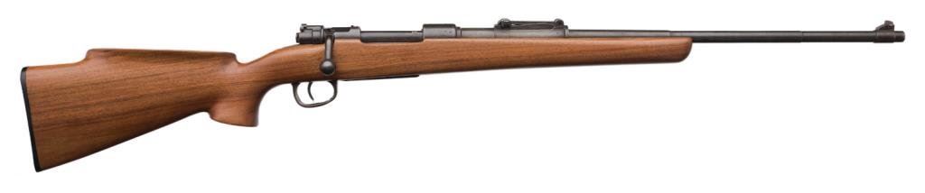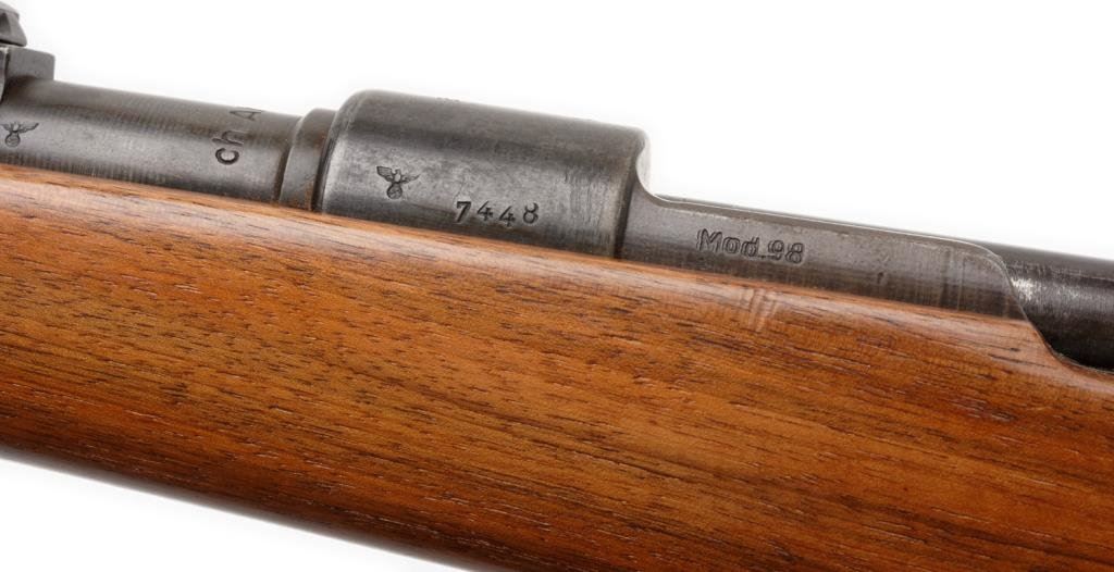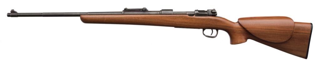 **Sporterized 98 Mauser bolt action rifle, 8mm caliber, 24” barrel, S/N 7448, blued finish, custom wood stock; overall good + condition. Est.: $150-$300.