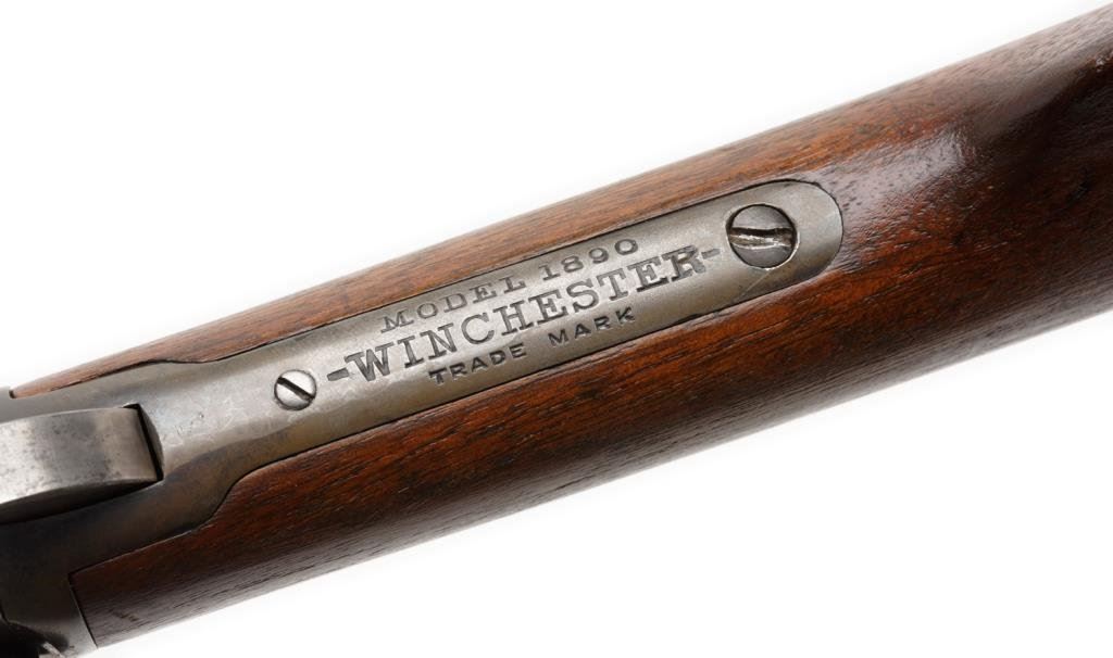 Winchester Model 1890 pump action rifle in .22 W.R.F. caliber, SN: 225536. In good overall condition with traces of blue. The action works well, the bore is fair to good, and the butt stock shows carved hole for a compass (It broke and was removed). Est.: $250-$500