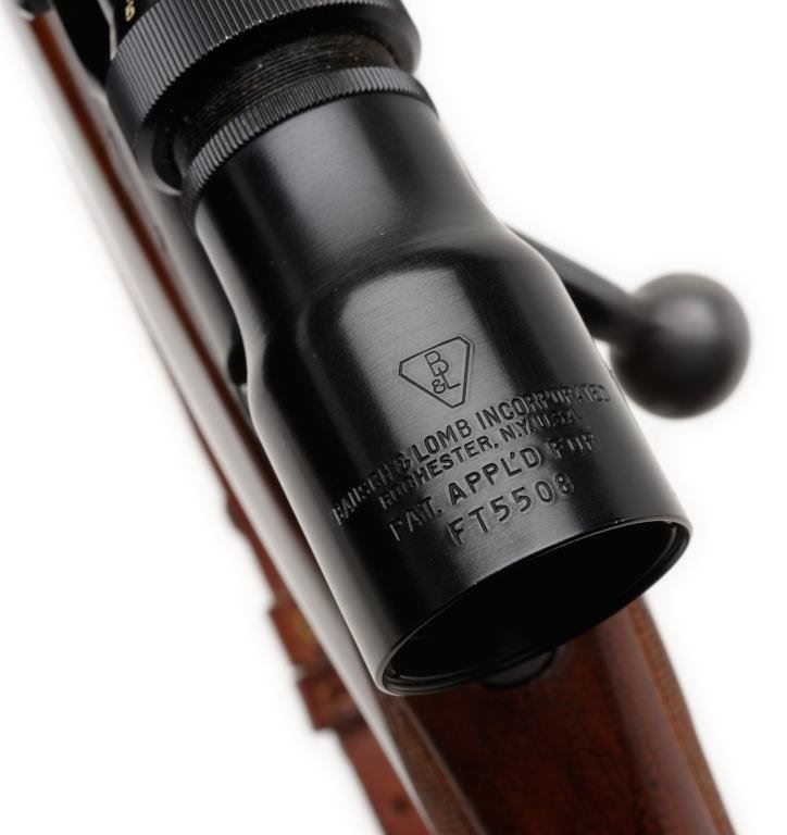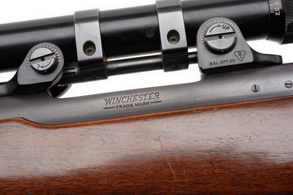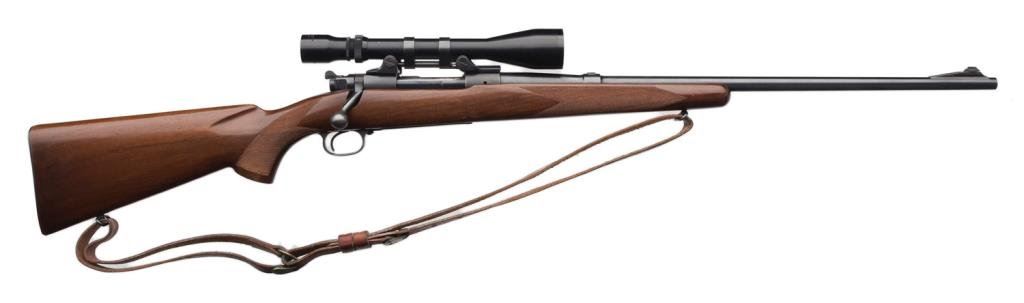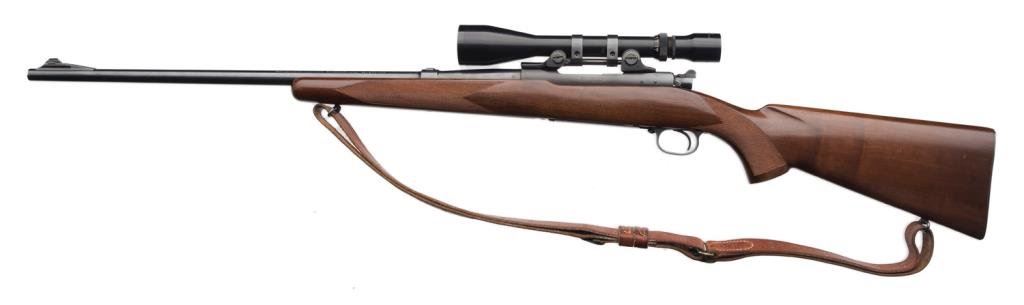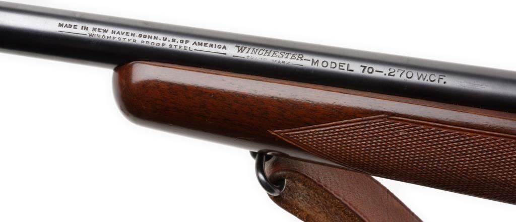 * Winchester Model 70 bolt action rifle, .270 WCF cal., serial #52168. The rifle is in overall very good to nearly excellent condition with a 24” blued barrel. The barrel and receiver retain nearly all of their blued finish with only slight handling marks evident. The ramp front sight remains, while the rear sight has been removed and the dovetail filled with a plug. The checkered wood stock is in overall fine condition with sharp checkering that appears to have been refreshed and small mars consistent with storage. The rifle ends with a checkered steel butt plate showing significant blue finish and includes a period leather sling. The rifle is topped with Bausch and Lomb adjustable proprietary mounts and a Balvar 8 variable power 2.5 x 8 scope. The bore is very good, the action is crisp and markings sharp. Manufactured in 1946, this Model 70 has been well cared for and seen little use. Est.: $600-$1,200.
