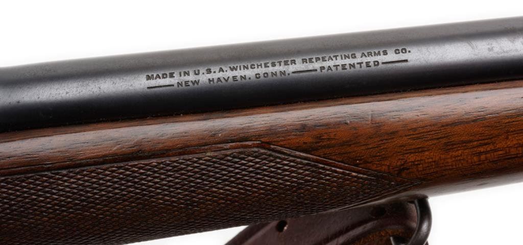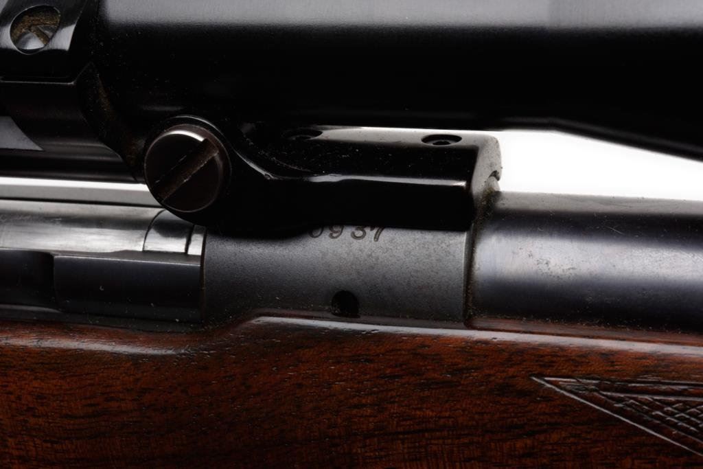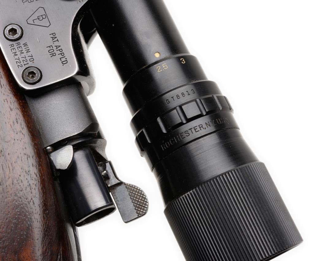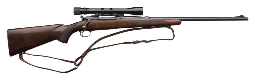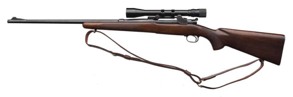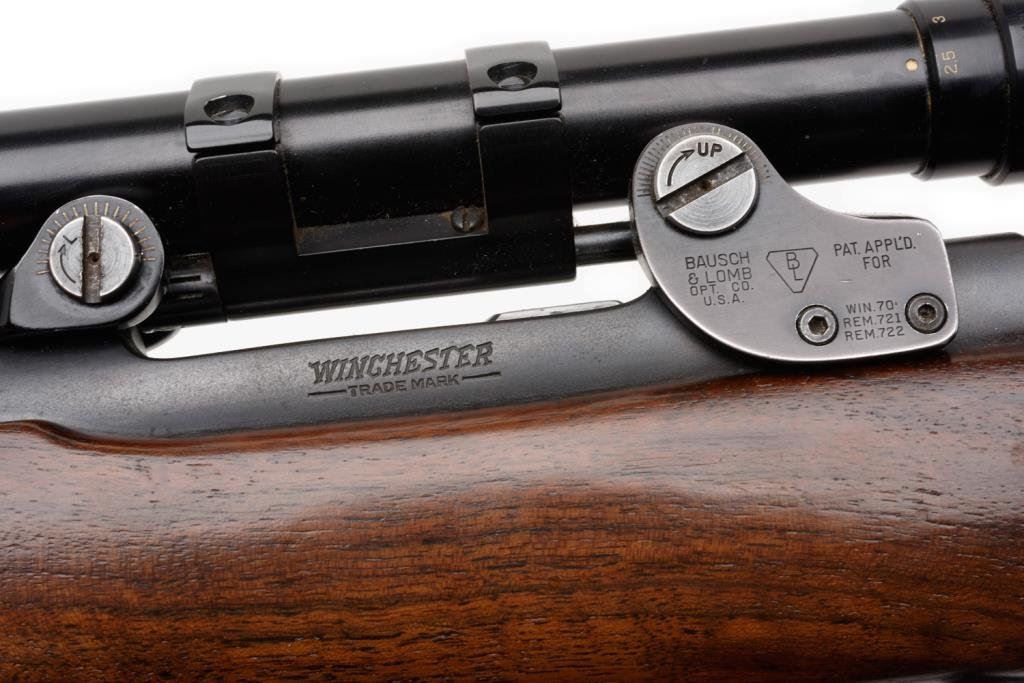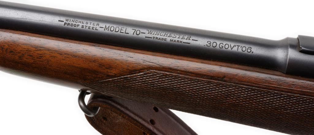 *Winchester Model 70 bolt action rifle, 30/06 cal., serial #60937. The rifle is in overall very good to nearly fine condition with a 24” blued barrel. The barrel and receiver retain the majority of their blued finish with some small losses of finish on top of the barrel and at the muzzle. The ramp front sight remains, while the rear sight has been removed and the dovetail filled with a plug. The checkered wood stock is in overall fine condition with sharp checkering and only small mars consistent with storage. The rifle ends with a checkered steel butt plate showing significant blue finish and includes a period leather sling. The rifle is topped with Bausch and Lomb adjustable proprietary mounts and a Balvar 5 variable power 2.5 x 5 scope. The bore is very good, the action is crisp and markings sharp. Manufactured in 1947, this Model 70 remains a classic. Est.: $600-$1,200.