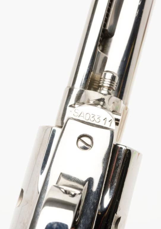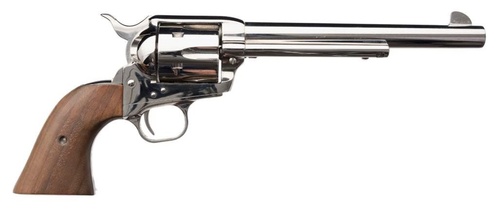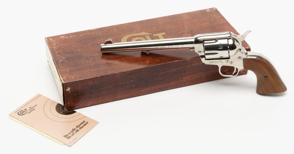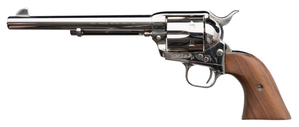**Colt early 3rd Generation SAA revolver, .45 caliber, 7.5” barrel, S/N SA03311, nickel finish, wood grips in overall like new condition with factory wood grain cardboard box and inserts. Est.: $700-$1,400.