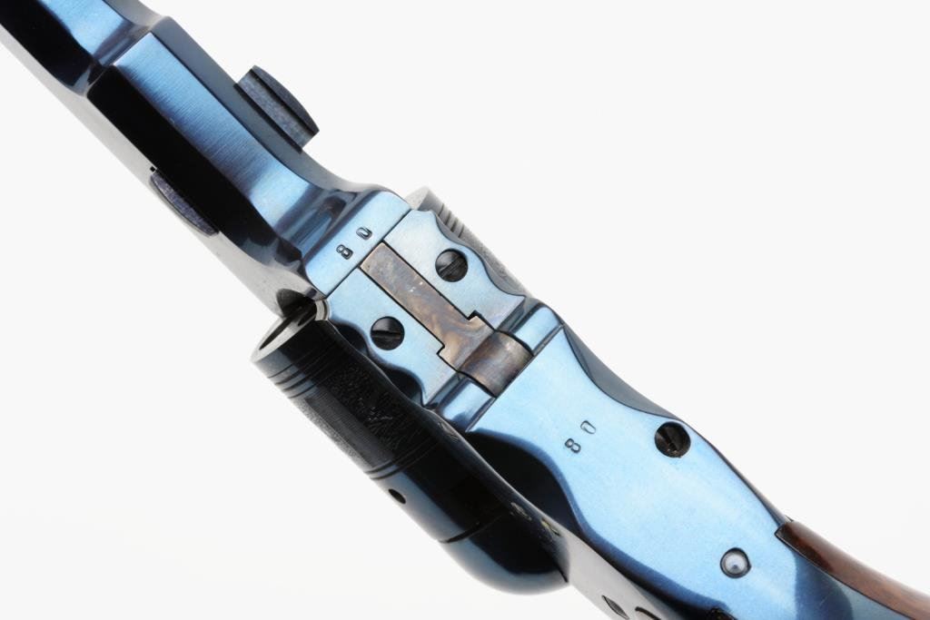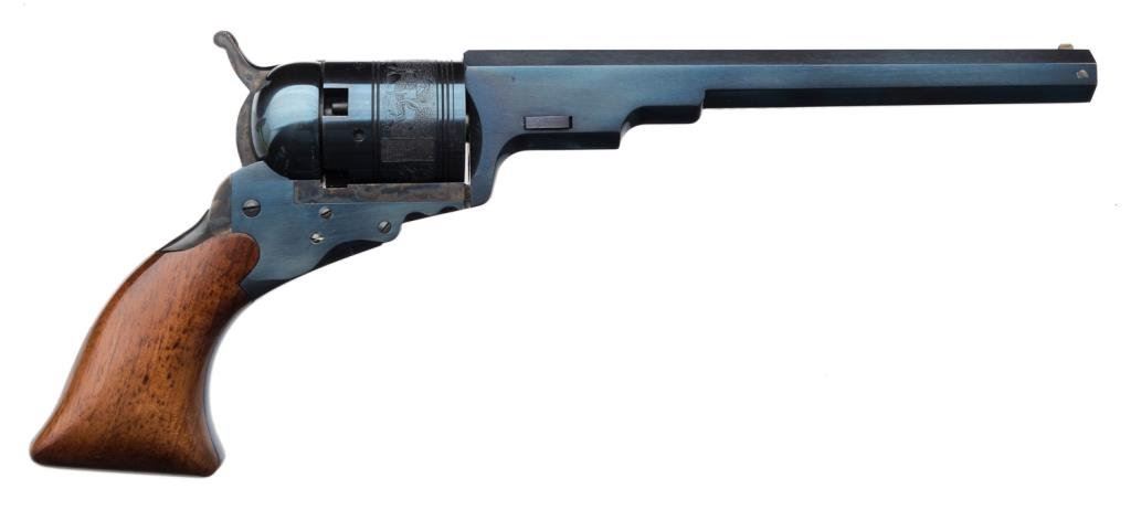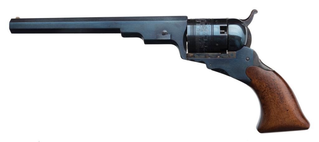 Cased with accessories Colt Commemorative Modern Texas Paterson percussion revolver , .36 caliber, 7.5” octagon barrel, S/N 80 in minty condition overall with beautiful French-style lined case with finely accomplished modern copies of accessories. Est.: $500-$1,000.